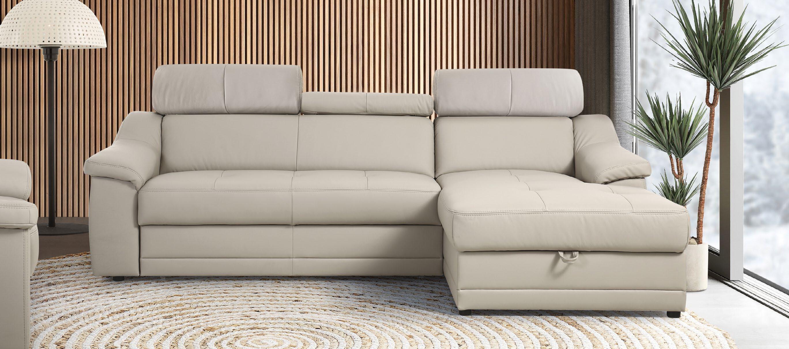 Usnjena kotna sedežna garnitura BERNIE 176x226cm, leva ali desna postavitev, ležišče, predal, usnje/um.usnje 516 taupe ali 518 siva. Curry barva usnja za doplačilo.