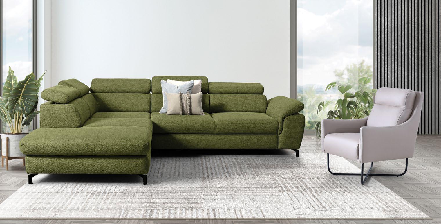 Kotna sedežna garnitura SKYLER, vzmeteno 238x280cm, leva ali desna postavitev, ležišče, predal, 5x nastavljiv vzglavnik, blago LUIS 39 zelena ali 85 siva