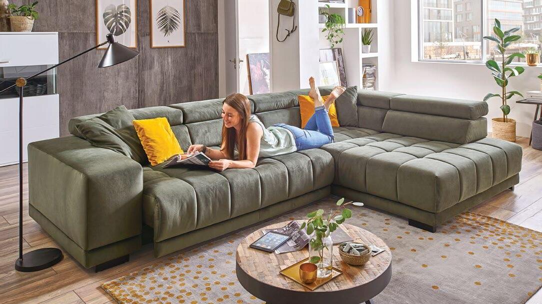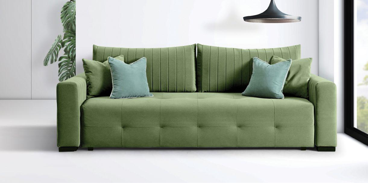 garnitura MANILA, vzmeteno 315x212cm, leva ali desna postavitev, ležišče 137x248cm, predal, material kat. 2 SOLID zelena