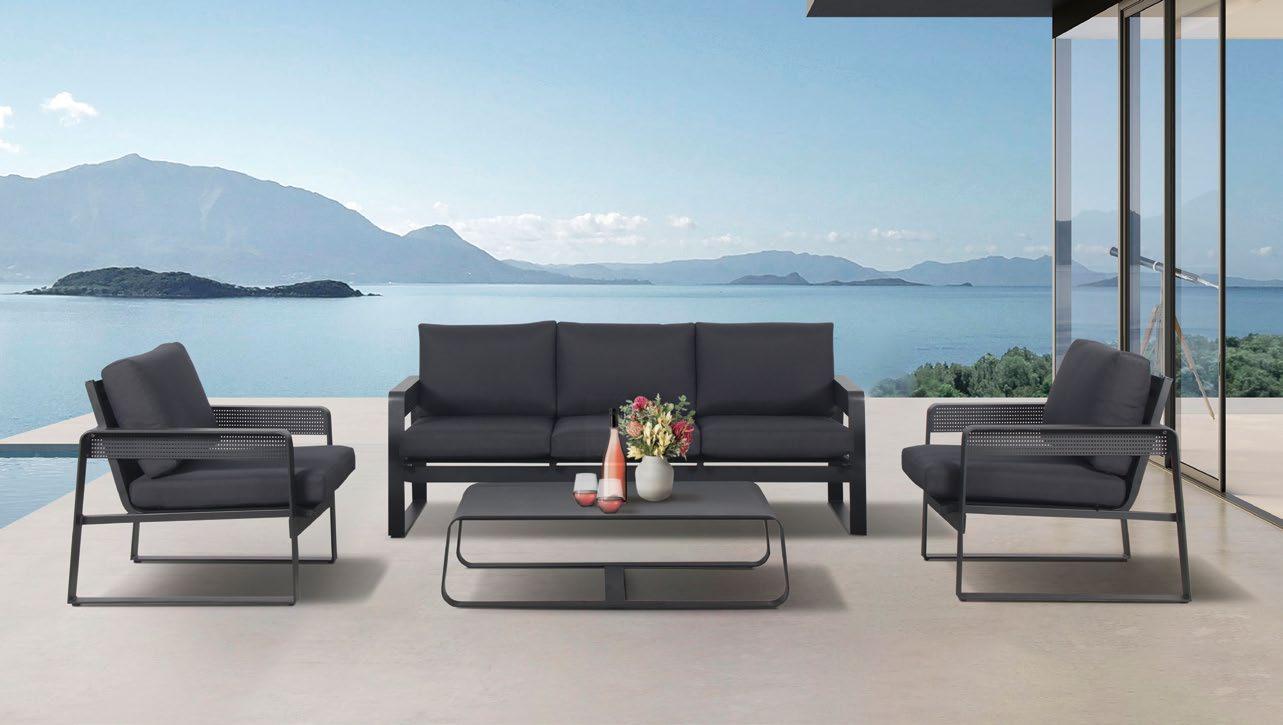 €2.590 Set ANCONA, 4 kosi,3-sed 203x81cm z blazinami, 2x fotelj 73x81cm z blazinami in mizica 65x126cm, aluminij/vrv, črna ali bela DOBAVA