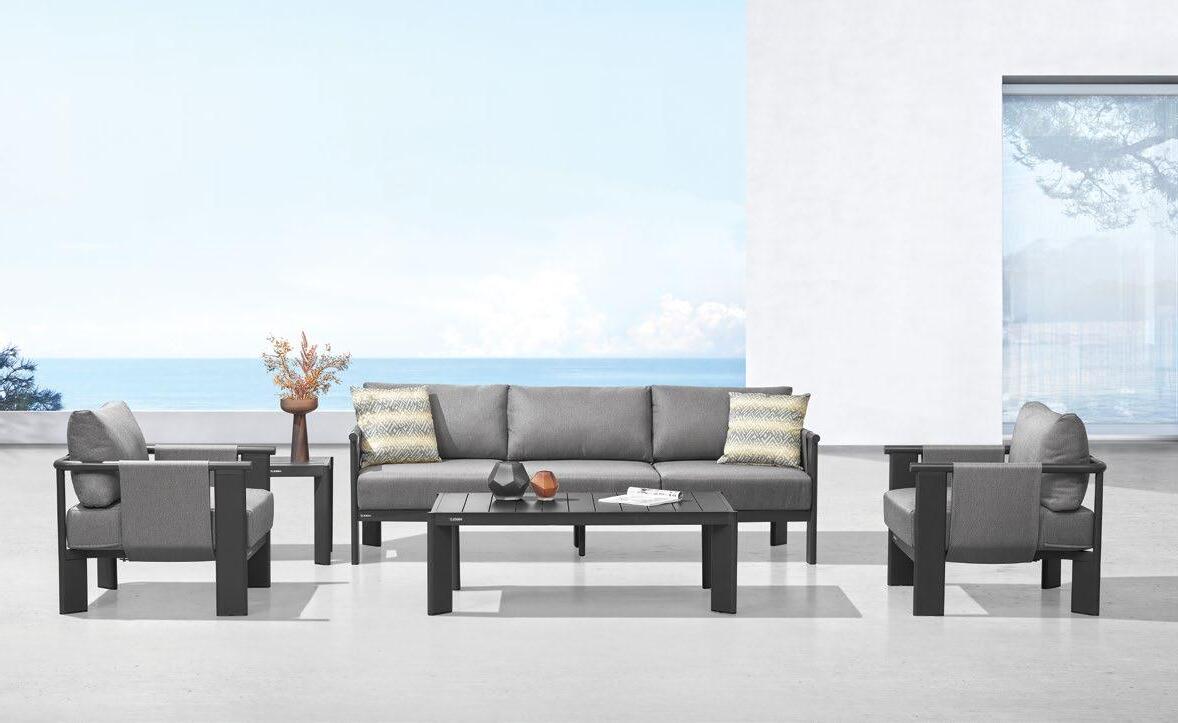 €4.175 Set KAROLINA, 4 kosi, 3-sed z blazinami 199x85cm, 2x fotelj z blazinami 92x85cm, mizica premer 80cm, terrazo plošča, aluminij črna ali bela