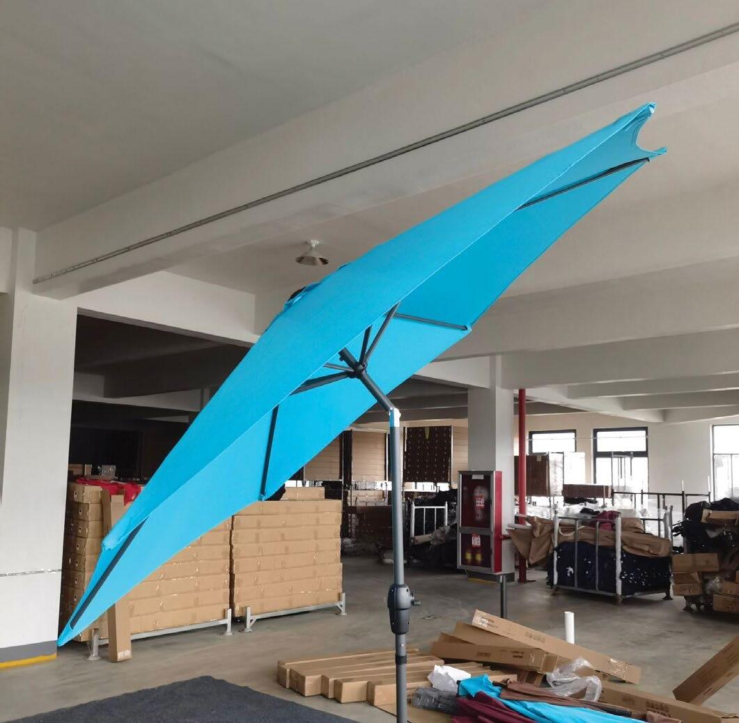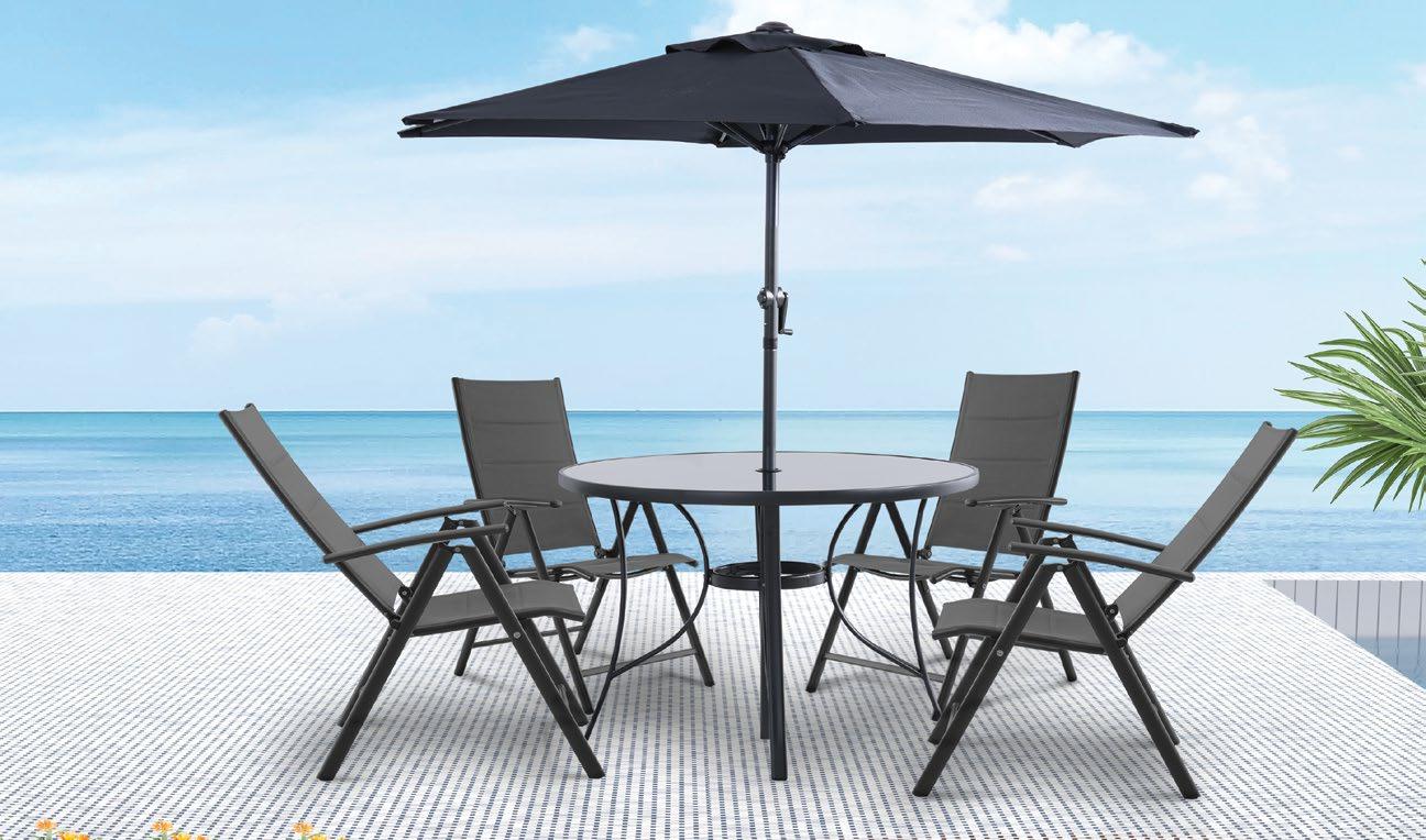 €589 Set DELUXEE, 6 kosov, miza premer 100cm, kovina/steklo, 4x nastavljiv stol, senčnik premera 2m