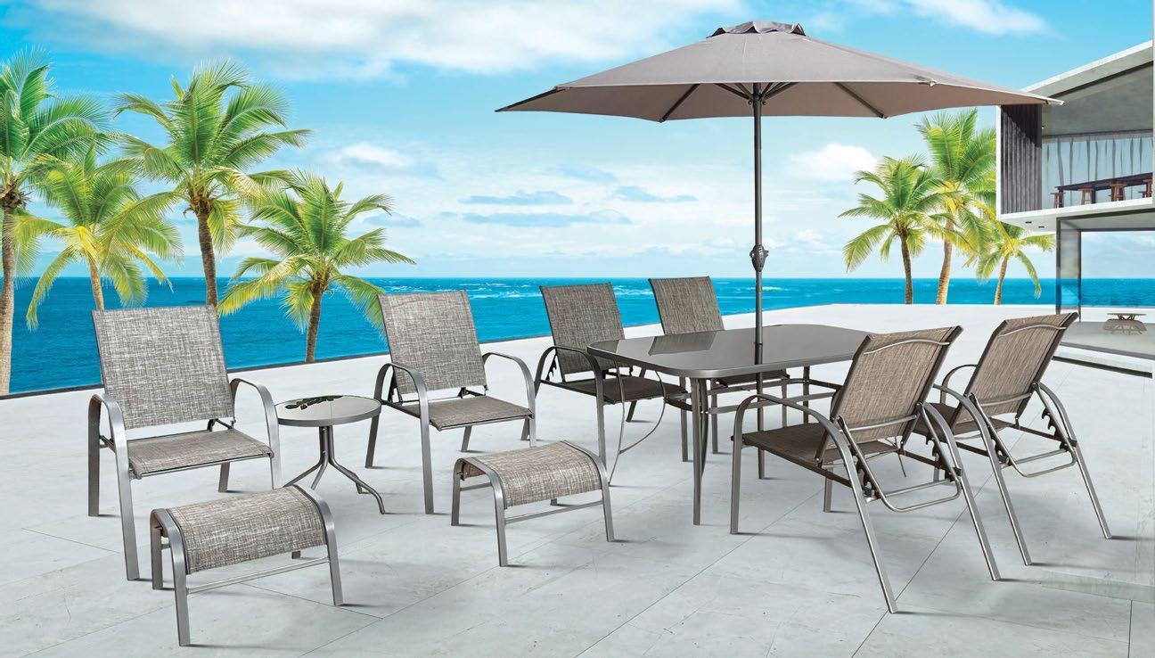 €1.090 Set VENUS, 11 kosov, miza 90x150cm, 6x nastavljiv stol, 2x tabure, stranska mizica in senčnik