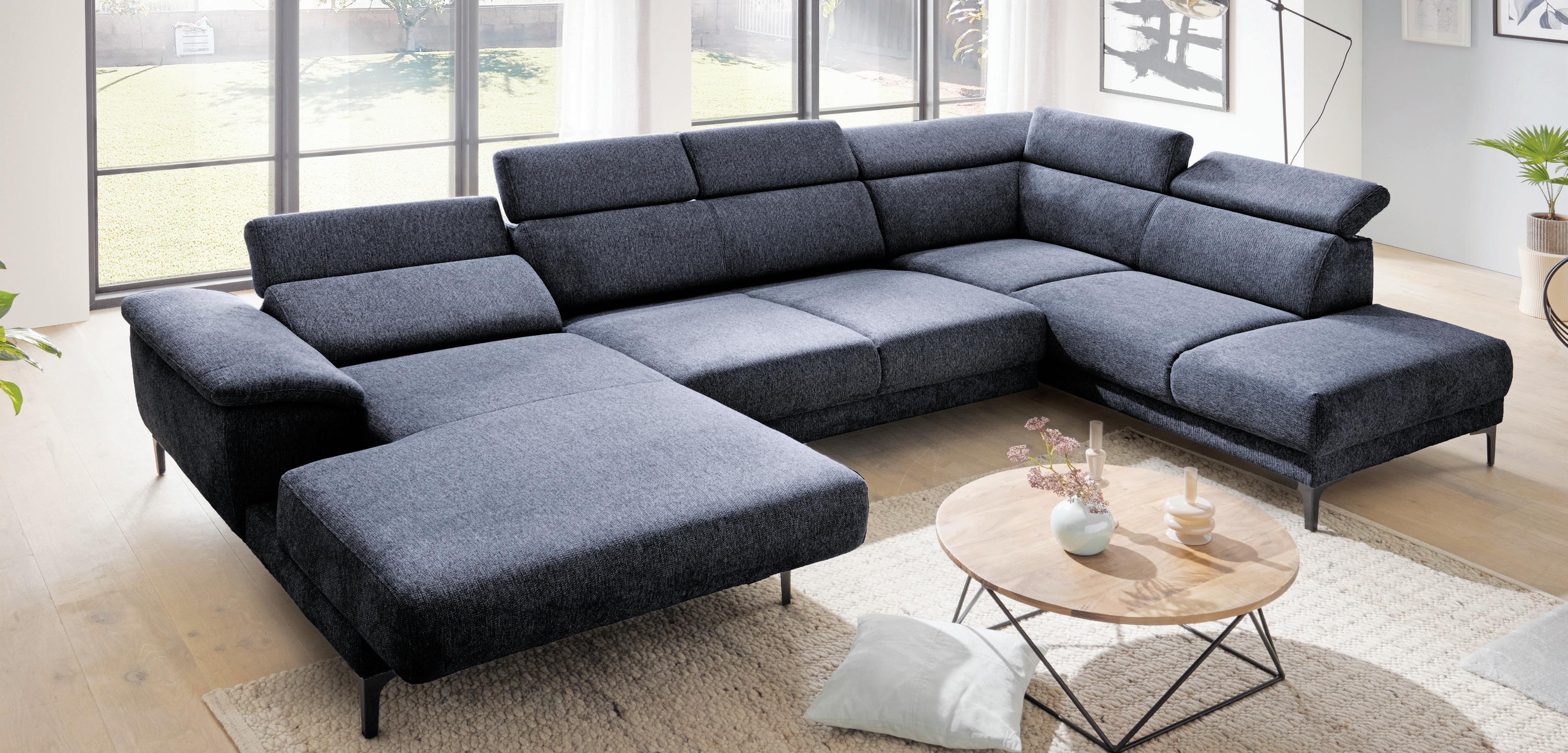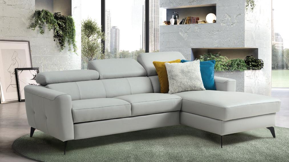 €3.990 Kotna sedežna garnitura COSBY 169x324x209cm, leva ali desna postavitev električni pomični počivalnik, električno pomično sedišče, predal, 6x nastavljiv vzglavnik, material kat. A CROWN 18 siva ali 15 temno modra €2.990 Usnjena kotna sedežna garniture TONINO, 282x220cm, leva ali desna postavitev,