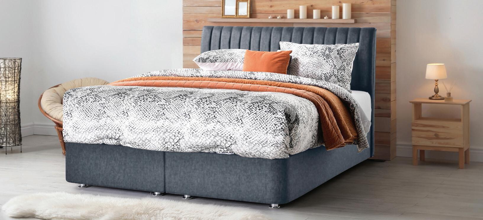 €499 KATY, 230x160cm, ležišče, predal, blago LINO 08 siva ali 02 bež