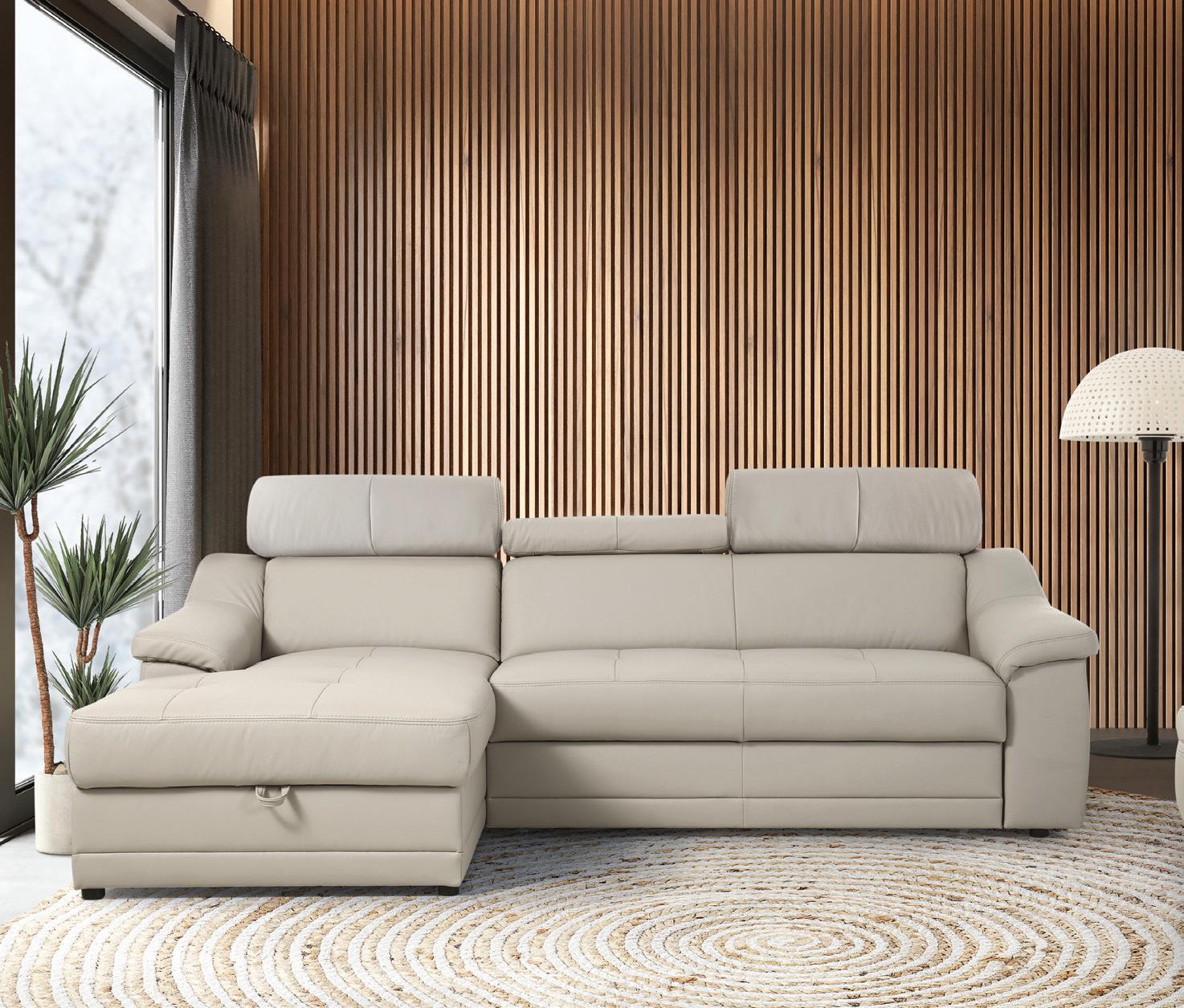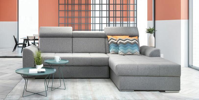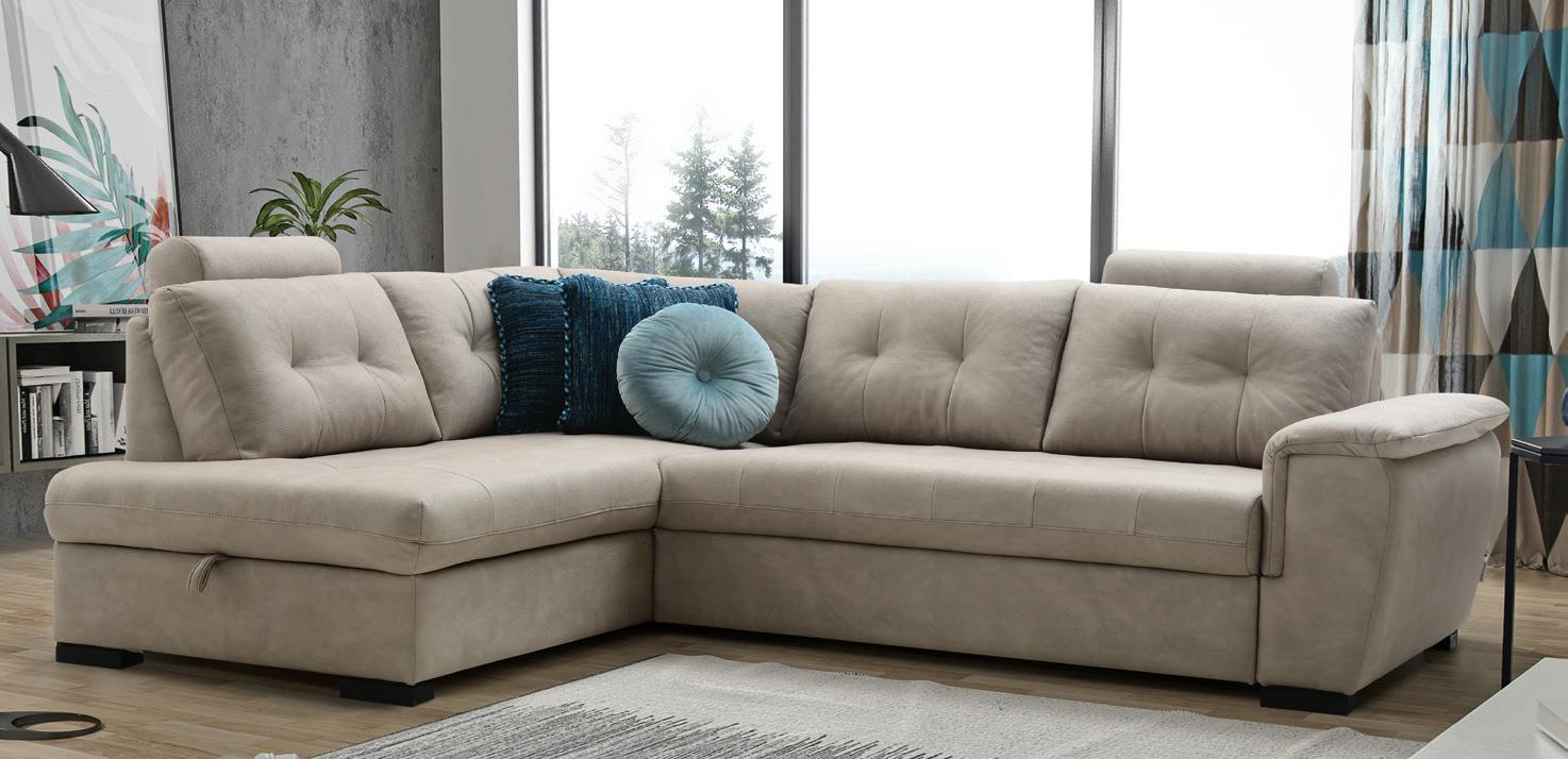 Kotna sedežna garnitura CUBINO L 220x270cm, ležišče, predal, 3x nastavljiv vzglavnik, blago COSMIC barve iz zaloge. Ostali materiali po naročilu za doplačilo.