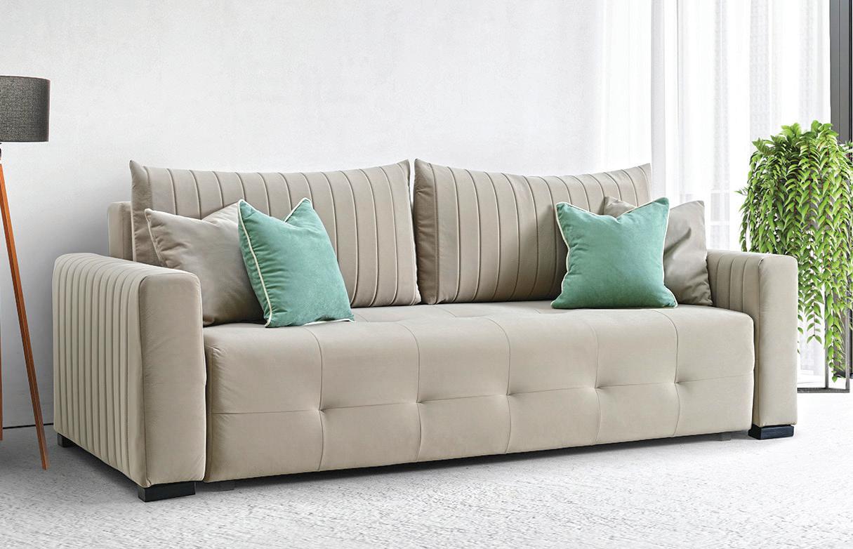 3-sed MALACHI, vzmeteno, 240x103cm, ležišče, predal, blago MAT VELVET barve iz zaloge. Ostali materiali po naročilu za doplačilo.