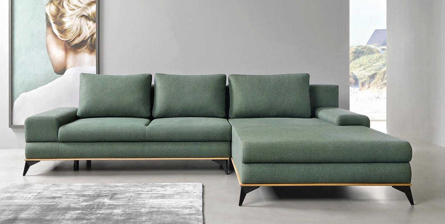 €1.890 Kotna sedežna garnitura TORETTO, vzmeteno 227x303cm, leva ali desna postavitev, ležišče, predal, 5x nastavljiv vzglavnik, material CAMPBAY zelena ali siva