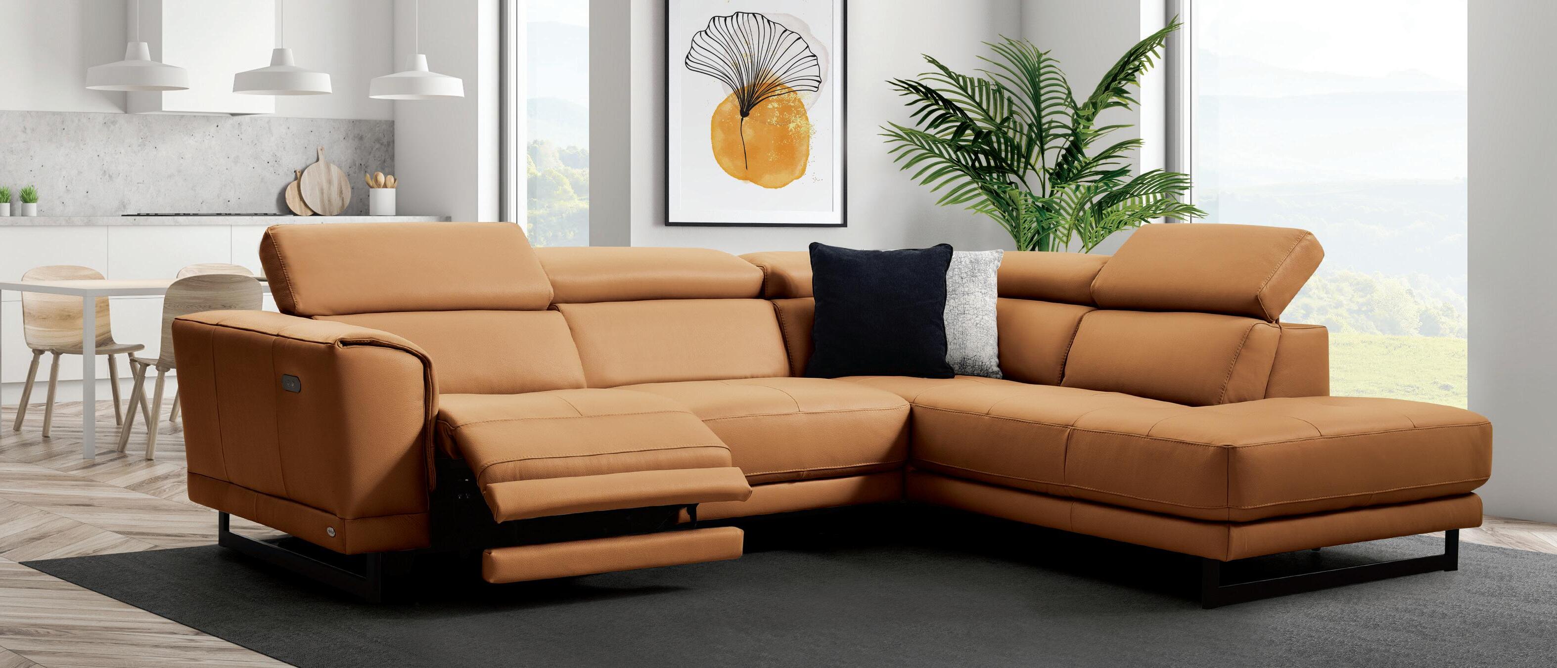 Kotna sedežna garnitura CALABRIA, vzmeteno, 293x220cm, leva ali desna postavitev, električno pomično sedišče, 4x nastavljiv vzglavnik, USB polnilnik, material K.8 curry ali taupe