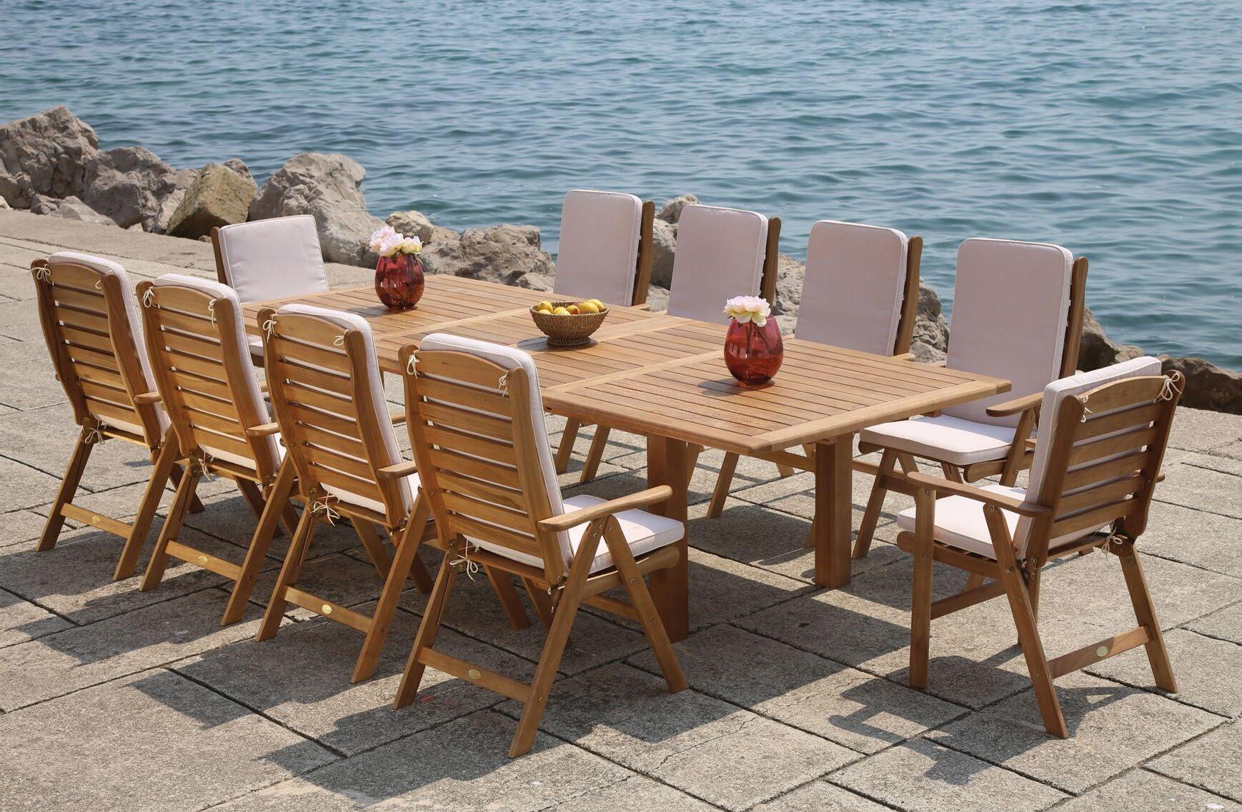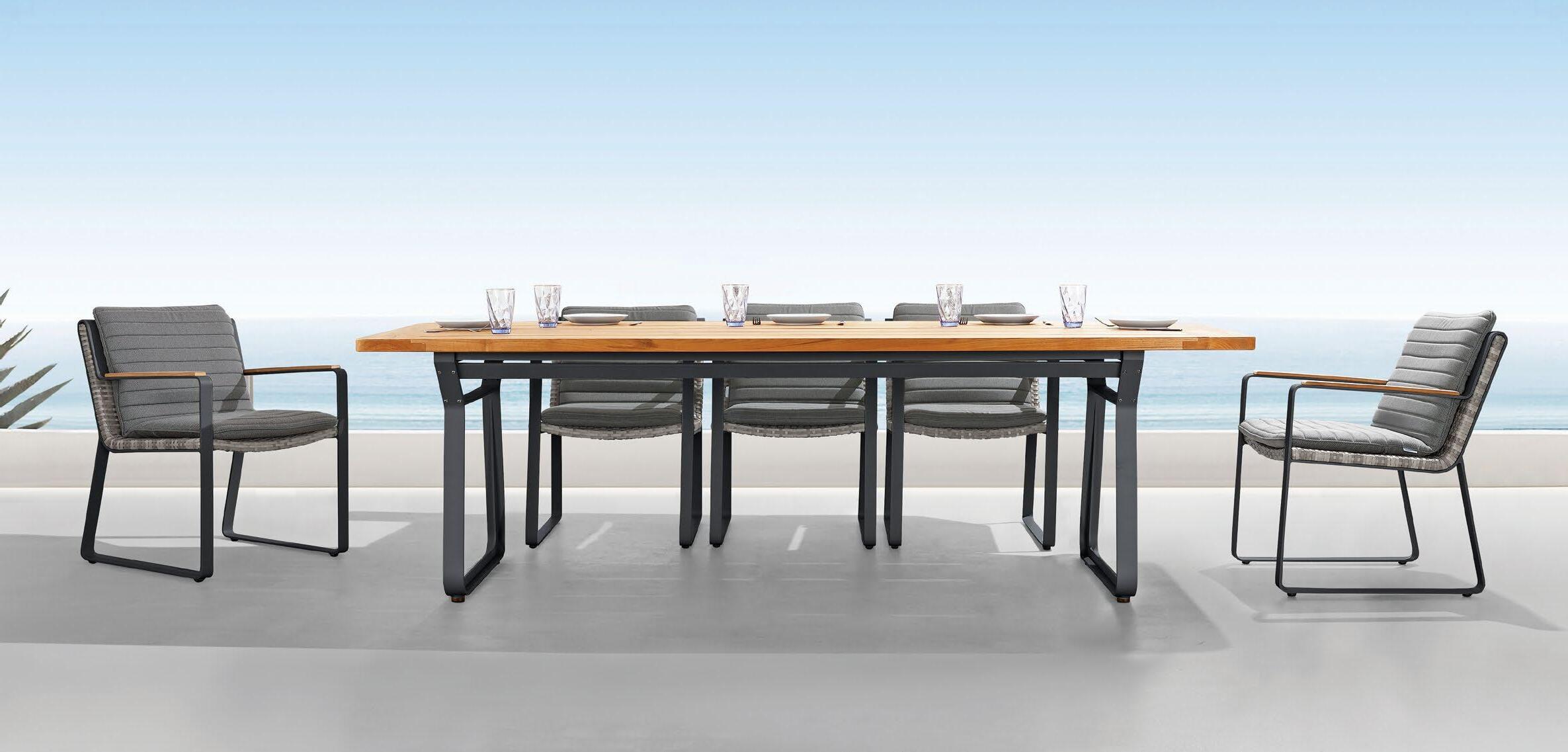 Set LYNE, 9 kosov miza 99x220cm, 8x stol z rokonaslonom in blazinami,akacija