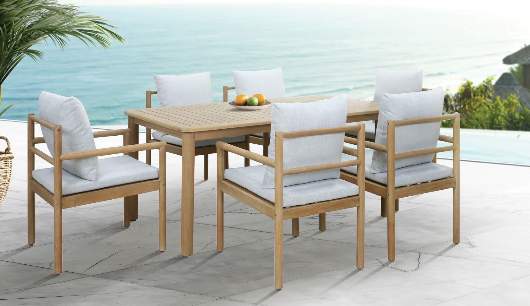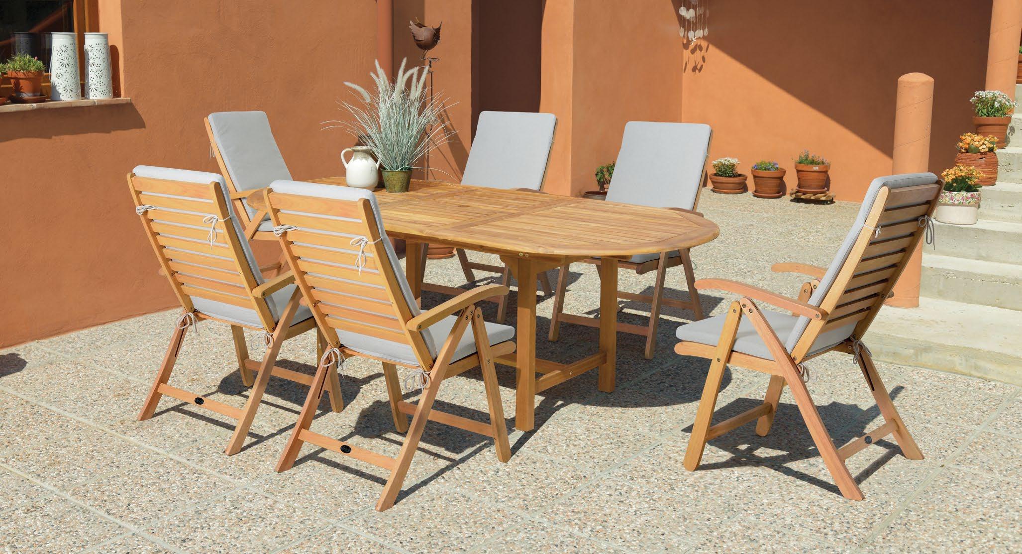 €1.290 Vrtni set RIMINI, 7 kosov miza 90x170cm in 6x stol z blazinami, akacija/vrv