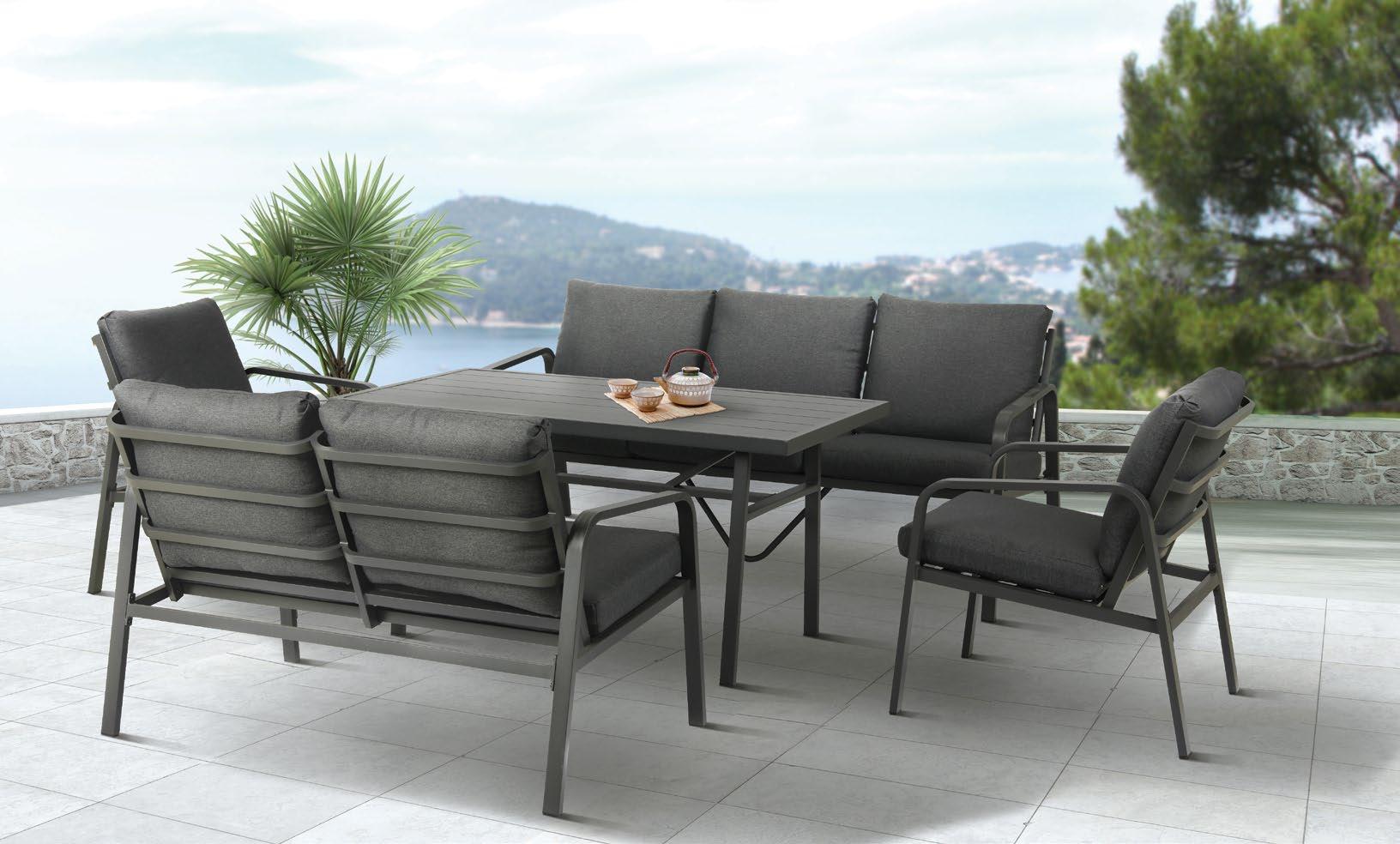 €1.290 €1.390 Set JUTA, 5 kosov, miza 73x140cm, 3-sed z blazinami 184x75cm, 2-sed z blazinami 126x75cm, 2x fotelj 63x75cm, aluminij antracit