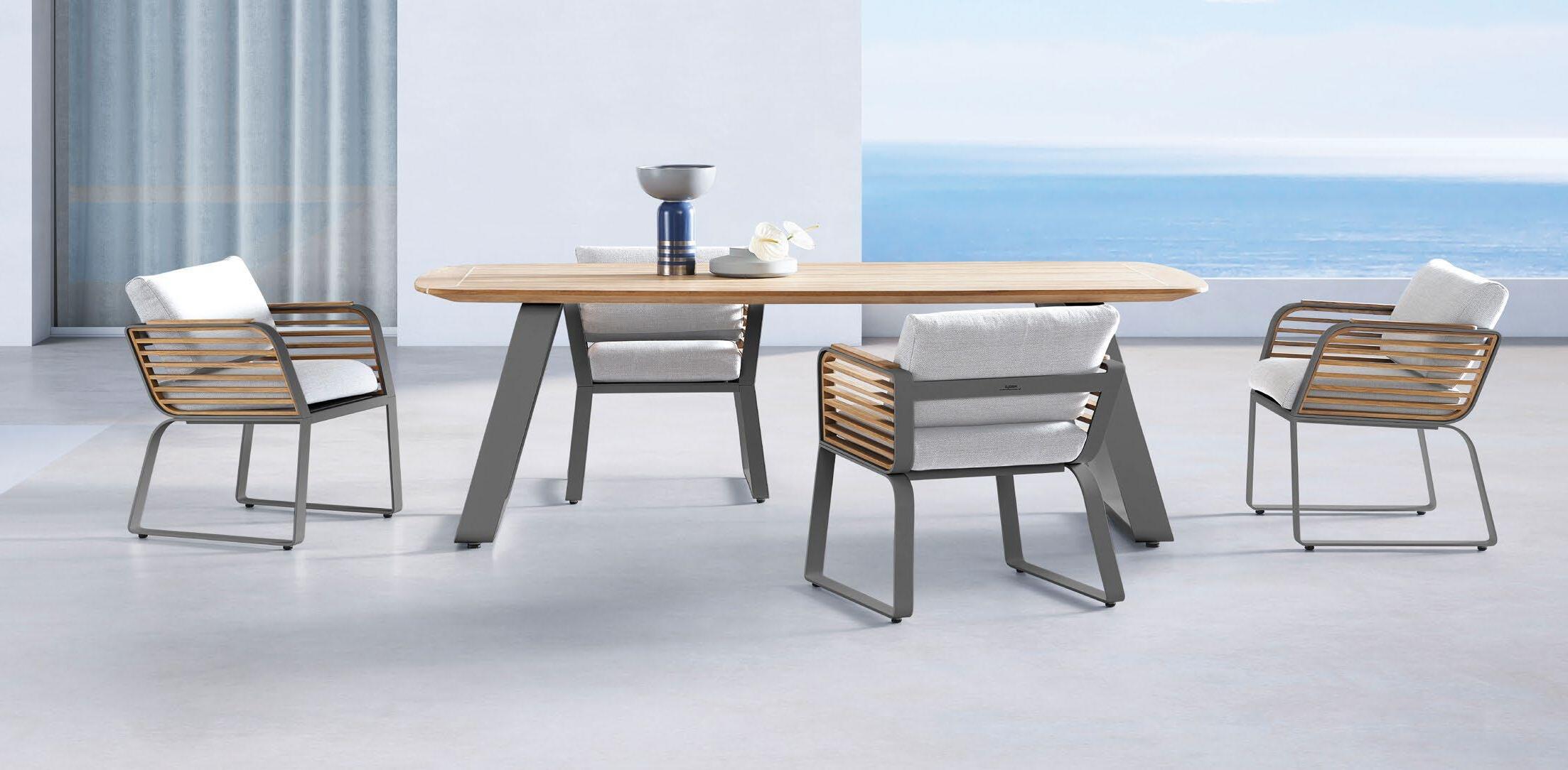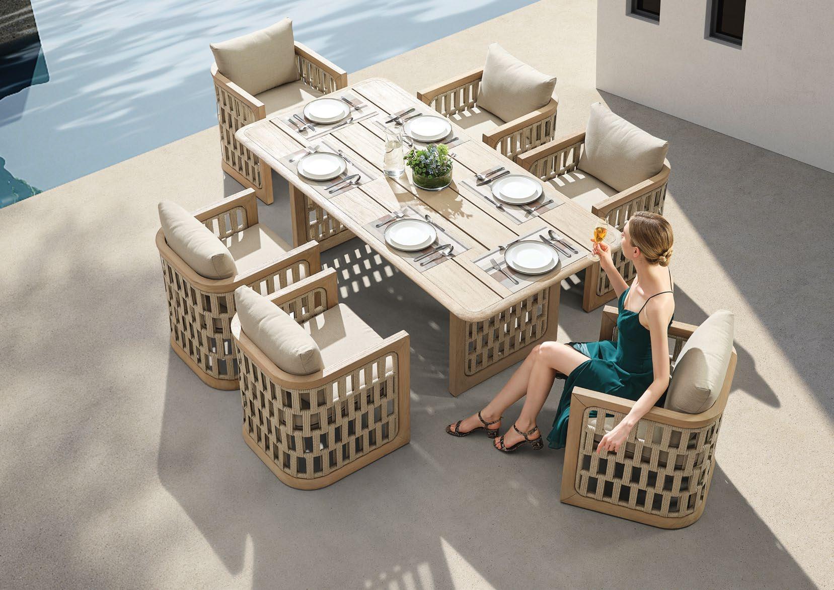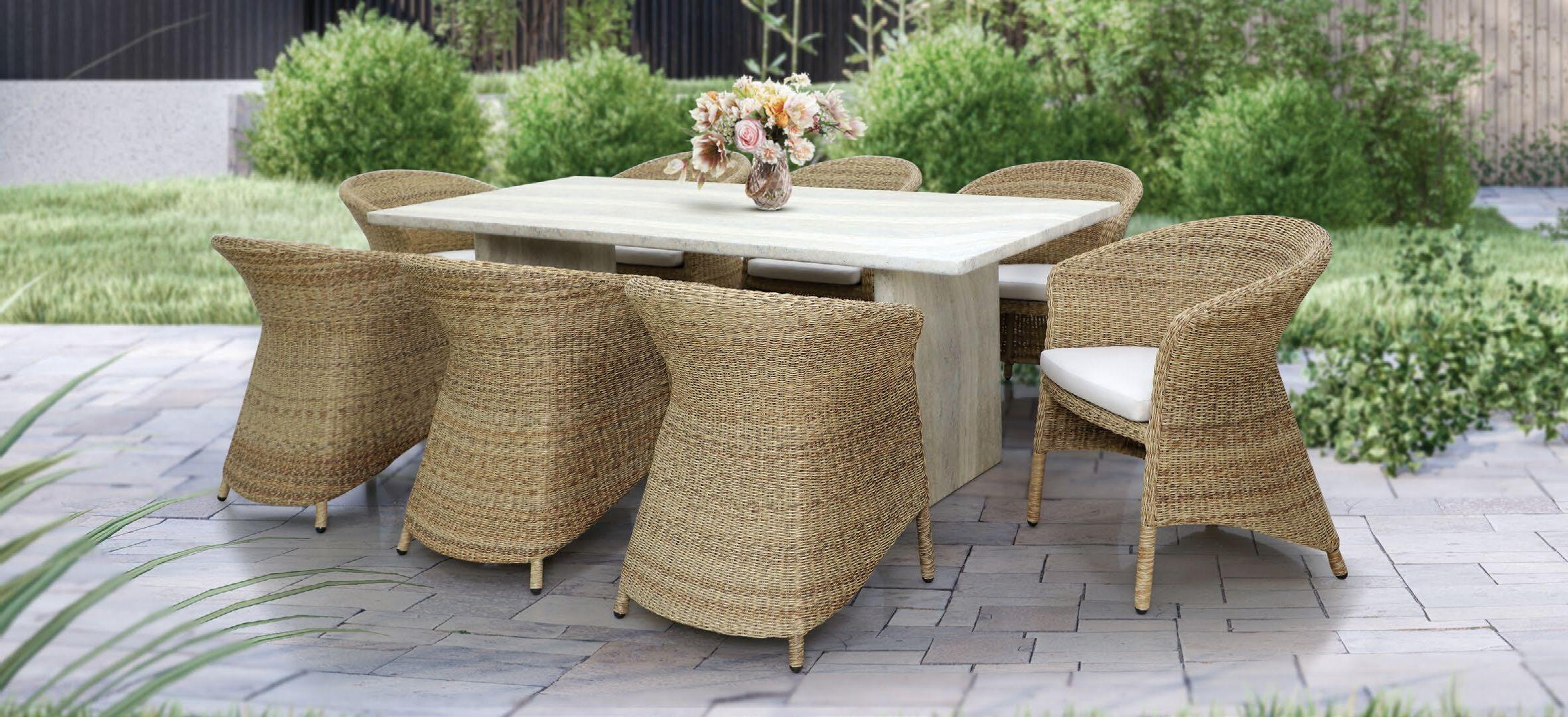 €4.890 Set MALI, 9 kosov miza 100x225cm, plošča travertino kamen, 8x stol z blazinami, eukaliptus barva tika/vrv €3.190 Set MALI, 4 kosi, 3-sed z blazinami 193x81cm, 2x fotelj z blazinami 70x81cm in mizica 70x120cm, plošča travertino kamen, eukaliptus barva tika/vrv