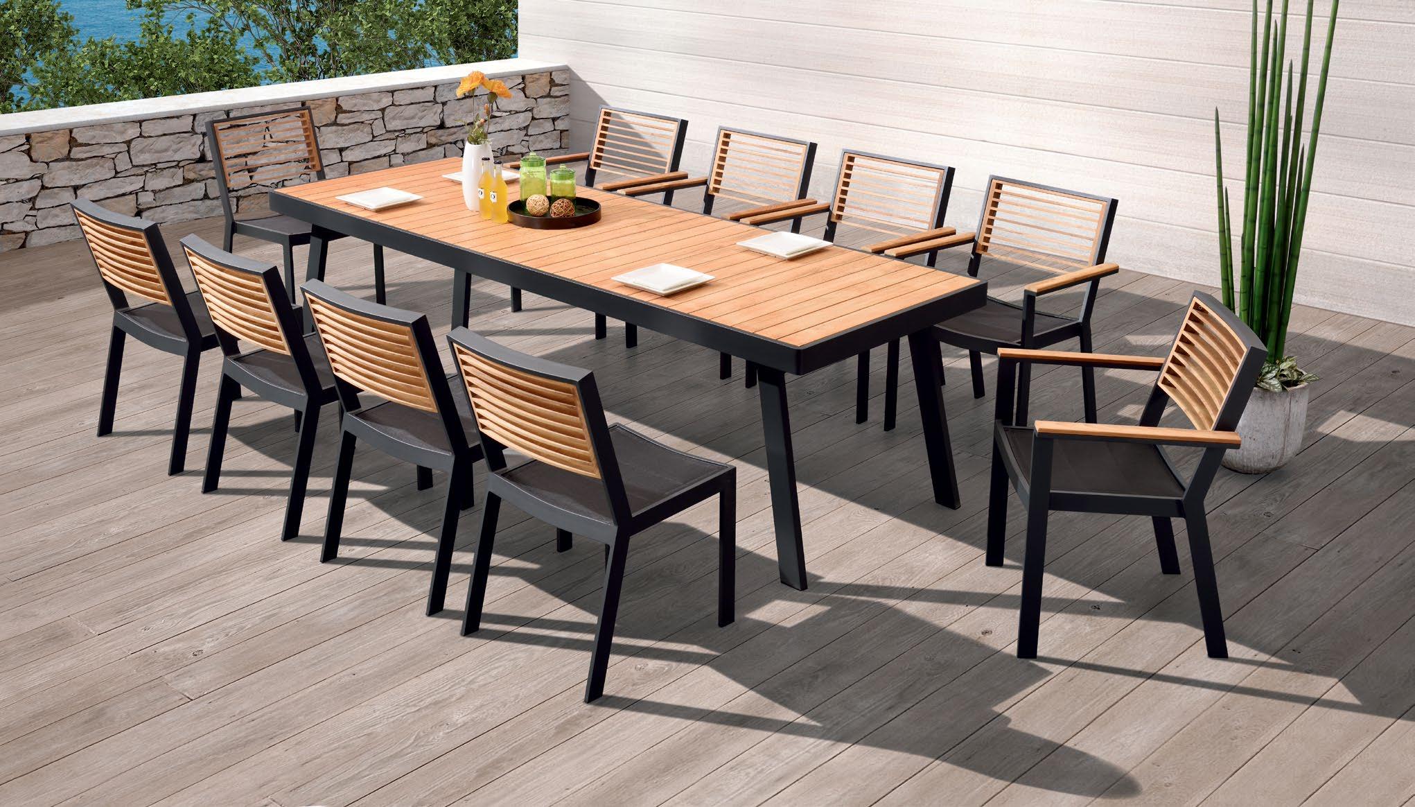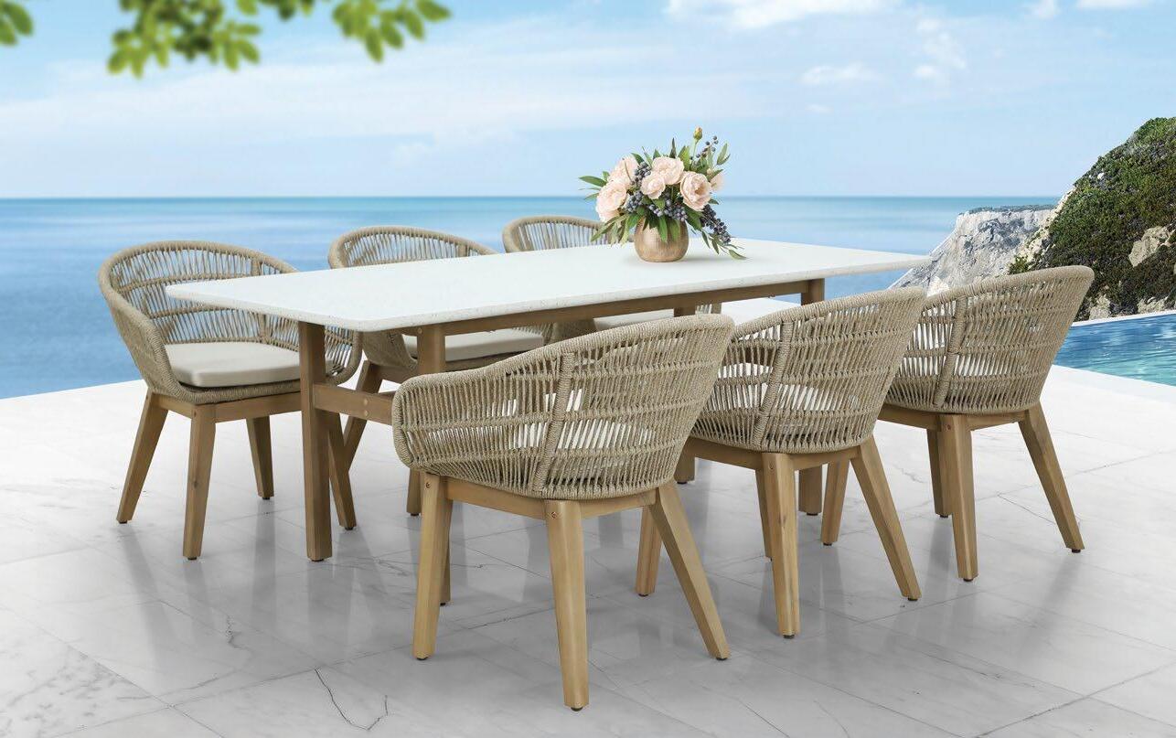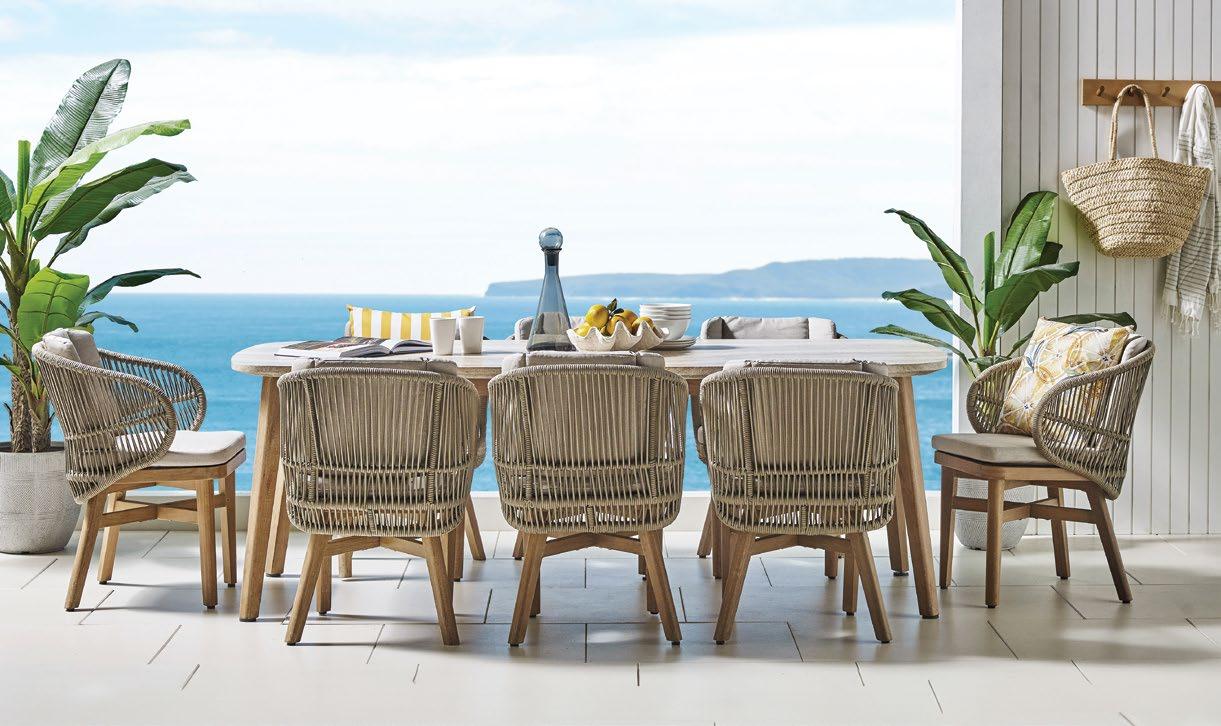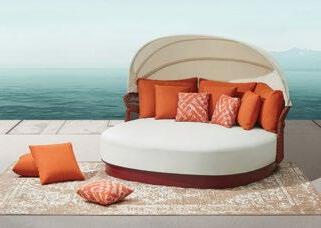 €4.890 Set MALI, 9 kosov miza 100x225cm, plošča travertino kamen, 8x stol z blazinami, eukaliptus barva tika/vrv €3.190 Set MALI, 4 kosi, 3-sed z blazinami 193x81cm, 2x fotelj z blazinami 70x81cm in mizica 70x120cm, plošča travertino kamen, eukaliptus barva tika/vrv
