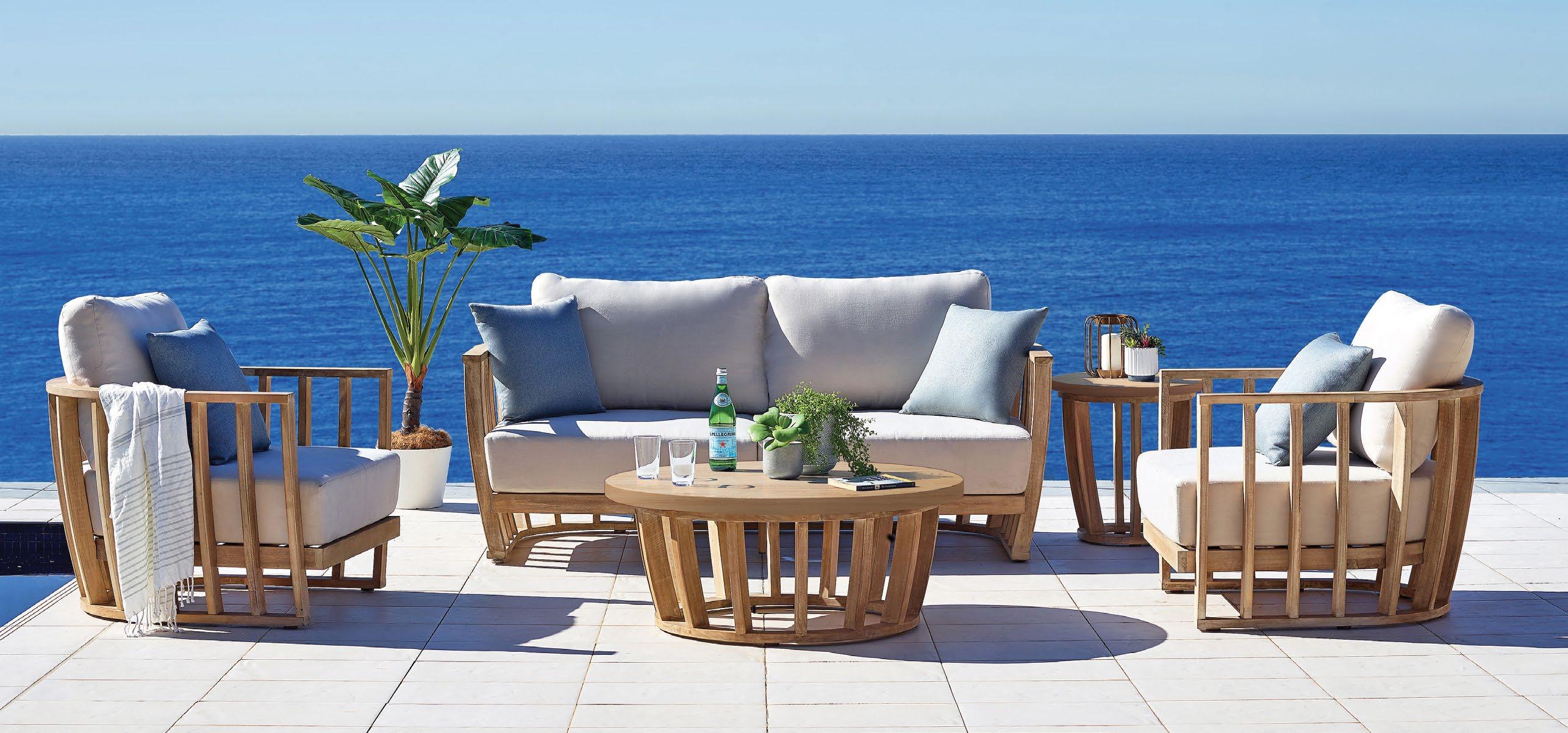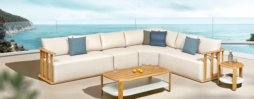 €3.670 Set WOODLAND, 4 kosi, 2-sed z blazinami 187x90cm, 2x fotelj z blazinami 92x90cm, mizica premer 100cm, eukaliptus €1.390 Set WOODLAND, 3 kosi 2x fotelj z blazinami 92x100cm, stranska mizica premer 50cm, eukaliptus