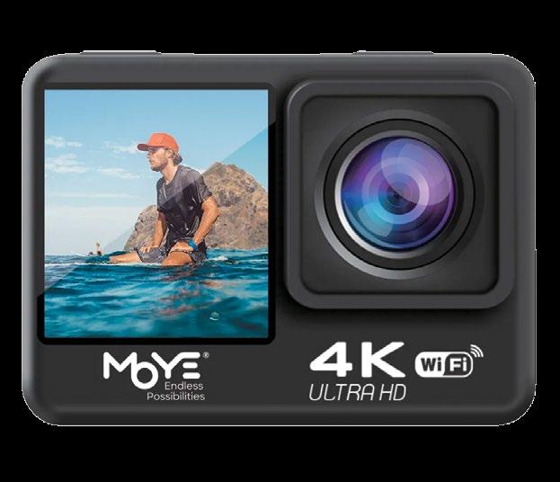Športna kamera Moye Venture 4K Duo Wi-Fi povezava, 20MP ločljivost fotografije, teža: 60g, LCD zaslon spredaj in zadaj.