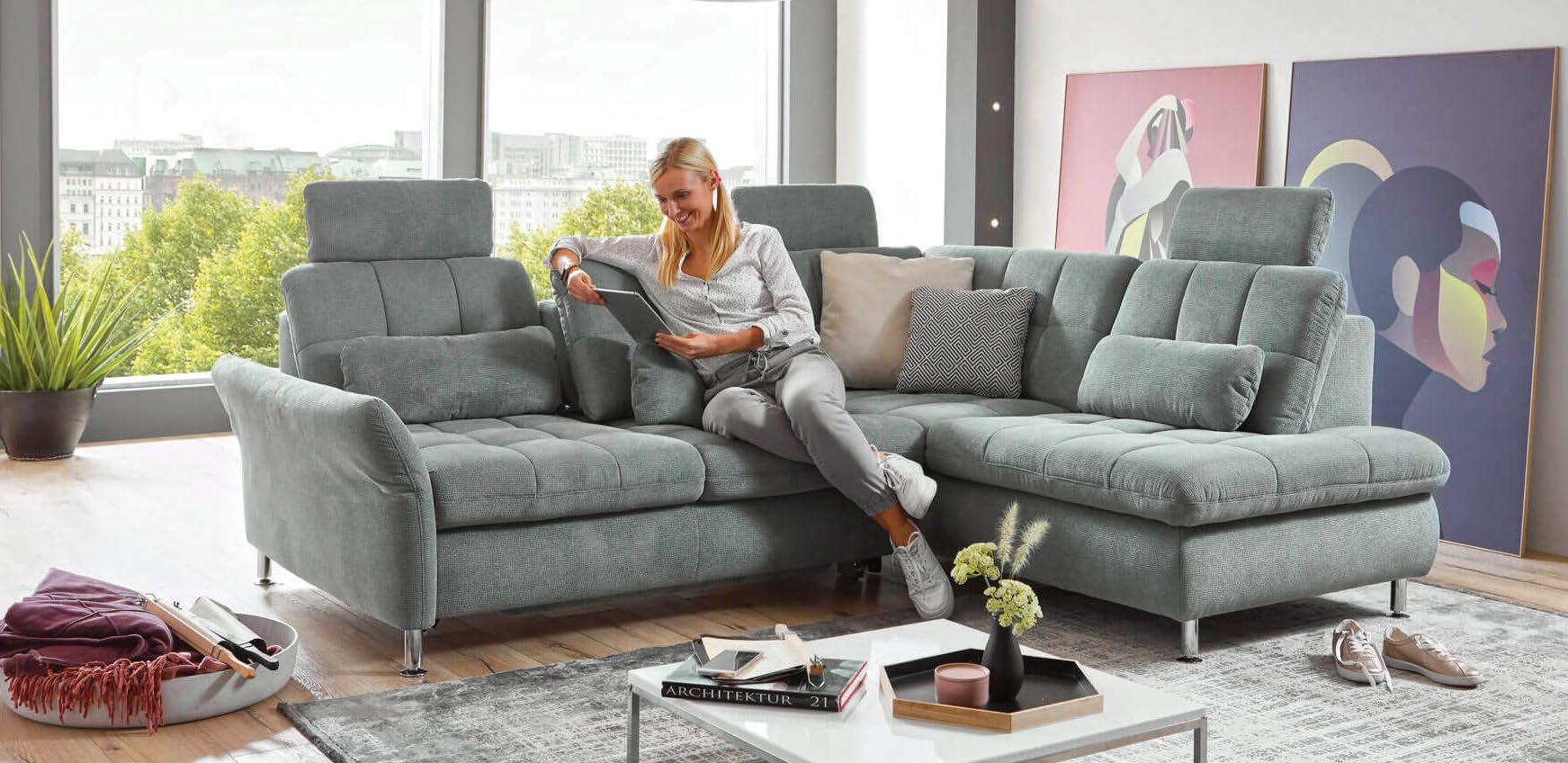 €1.790 Kotna sedežna garnitura MIREILLE, 181x293cm, material kat. C Ostale kategorije materiala, pomično hrbtišče, vzglavniki, električno pomičen počivalnik, nastavljiv rokonaslon ter ostale funkcije za doplačilo.