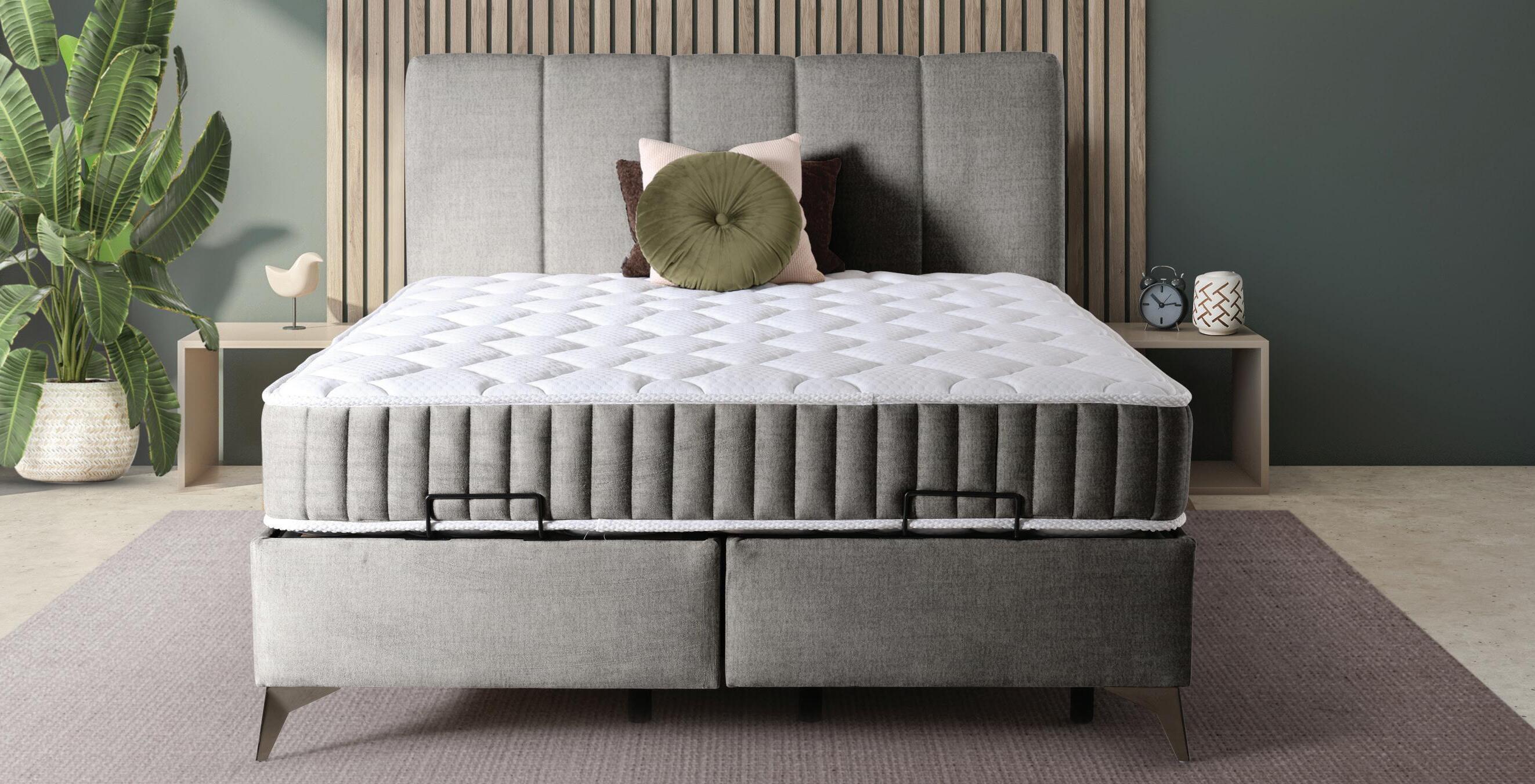 Set PERLA / V COMFORT 160x200cm, postelja PERLA, dvižno dno, blago VIVA siva, vzmetnica V.COMFORT, visoko žepkasto vzmetenje, nadvložek, aloe vera v prevleki. Višina vzmetnice 29cm.