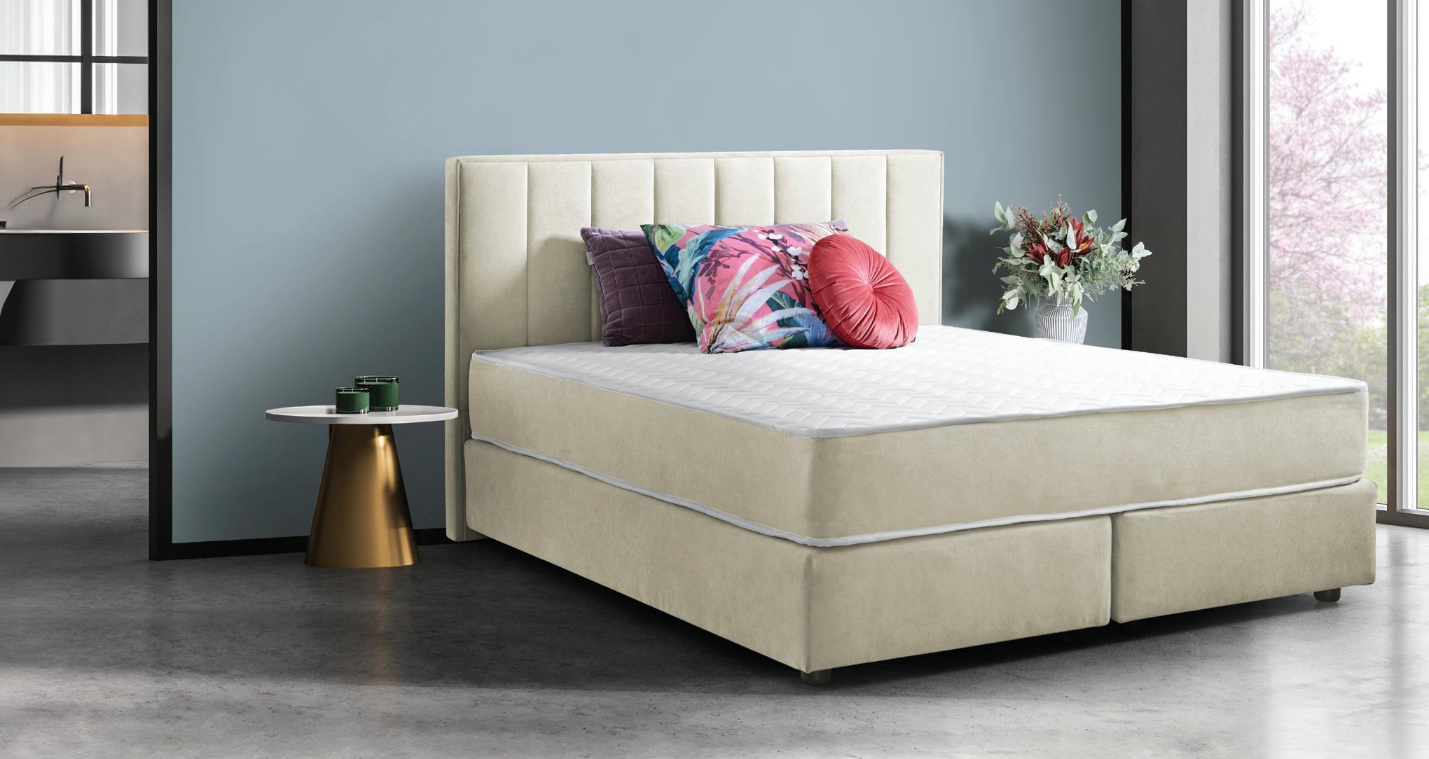€1.059 Boxspring postelja LIBRA, 160x200cm celotna postelja z vzmetnico, BONEL vzmetenje, 2x predal, blago LOCA 06 bež. Dobava takoj velja za 180x200cm €1.278 Set PORTO / BOWERY, 160x200cm posteljni okvir PORTO,dvižno dno, predal, blago siva, vzmetnica
