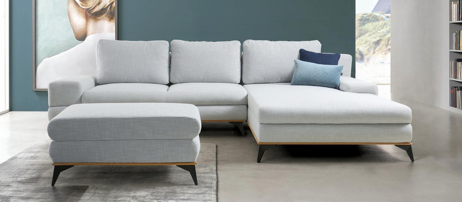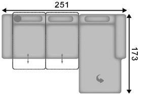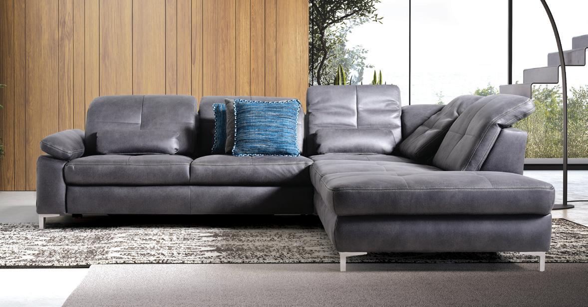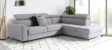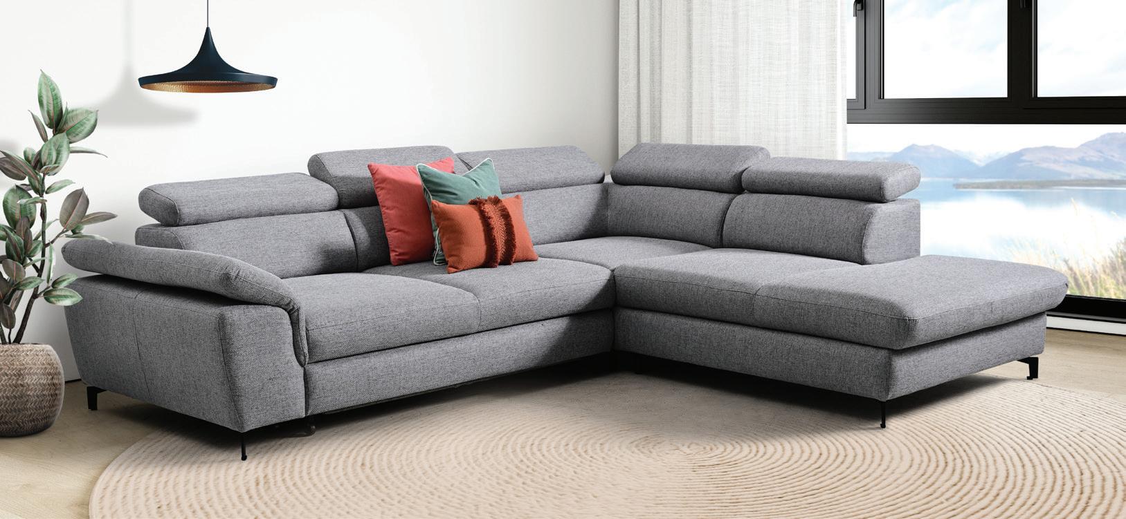 Kotna sedežna garnitura MESSAGE, 265x190cm, leva ali desna postavitev, nastavljivi vzglavniki, material kategorija dva. Ostale kategorije materiala, pomično hrbtišče ter ostale funkcije za doplačilo.