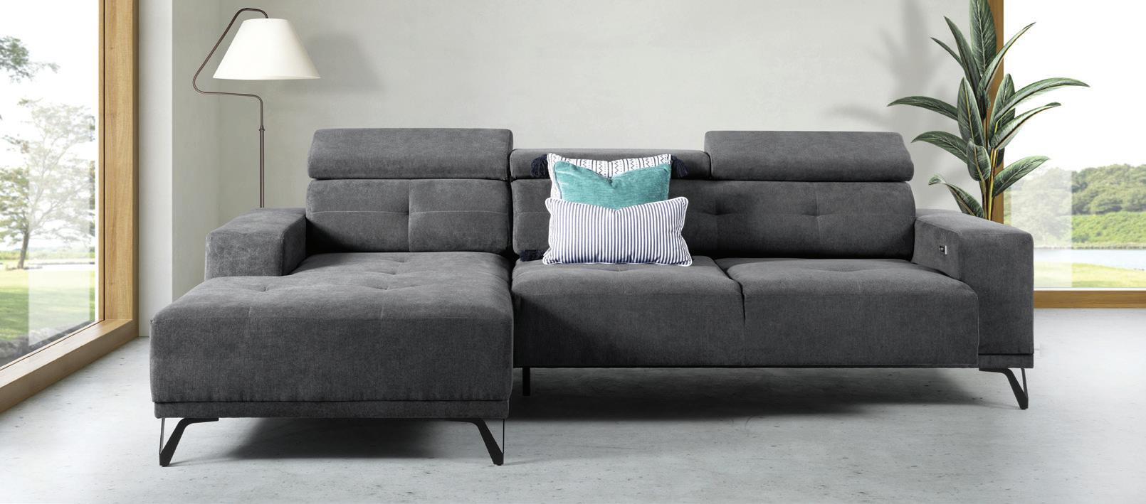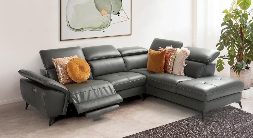 Usnjena kotna sedežna TONINO, 282x223cm, leva ali desna postavitev, 1x električni počivalnik, 5x nastavljiv vzglavnik, nastavljiv rokonaslon, predal, kovinske noge, usnje/um.usnje temno siva