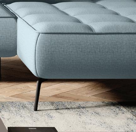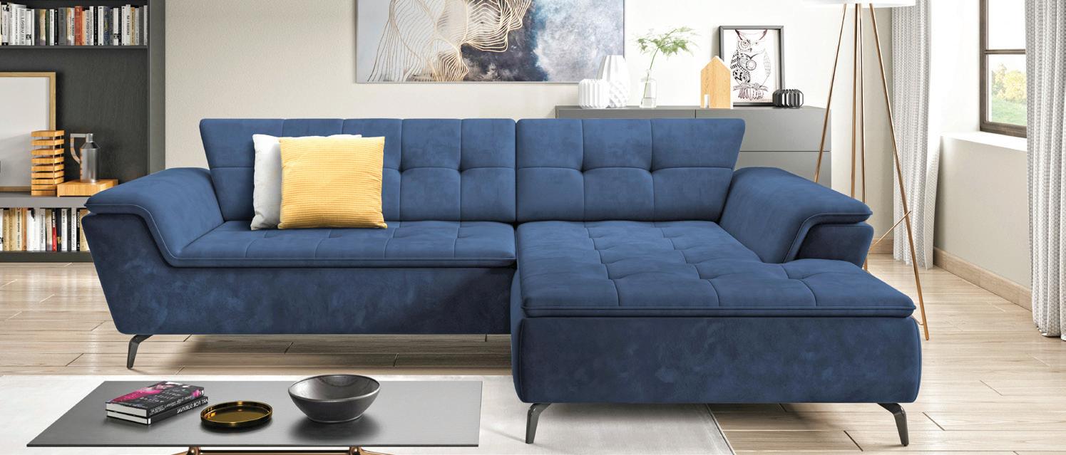 1.990 Kotna sedežna garnitura KOLTON, vzmeteno 178x265cm, leva ali desna postavitev, električni pomik sedišča za 25cm, 3x nastavljiv vzglavnik, blago ASTON temno siva in modra