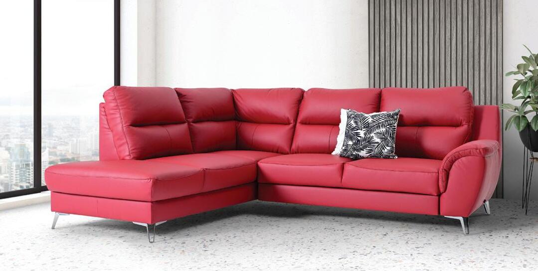 Usnjena kotna sedežna CORNELL, 200x246cm, leva ali desna postavitev, ležišče, predal, kovinske noge, usnje/um.usnje 510 rjava ali 502 rdeča. Ostale barve in kategorije usnja za doplačilo.