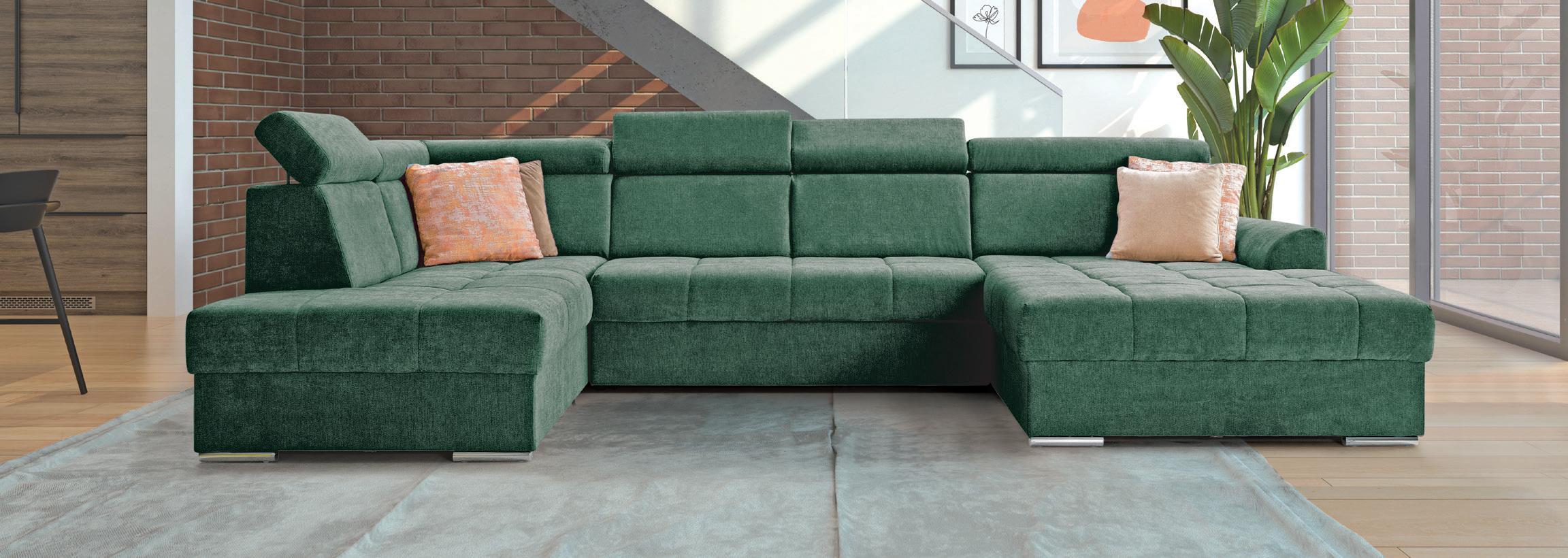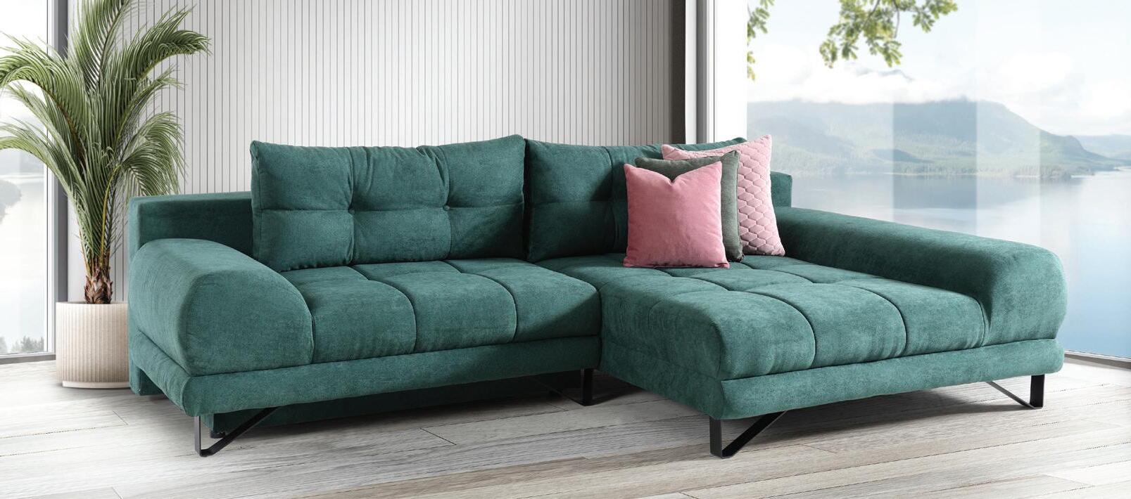 1.790 Kotna sedežna garnitura MANILA, vzmeteno 315x212cm, leva ali desna postavitev, ležišče 137x248cm, predal, material kat. 2 SOLID zelena. Ostale barve (bež) po naročilu za doplačilo.