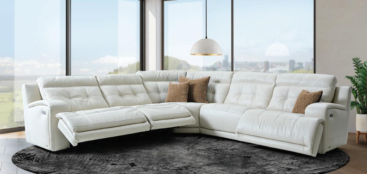Usnjena kotna sedežna BELLA, 234x319cm, leva ali desna postavitev, 2x električni počivalnik, usnje/um.usnje bež. Na sliki BELLA 319x319cm, 3x ele. počivalnik €3.990 €4.390