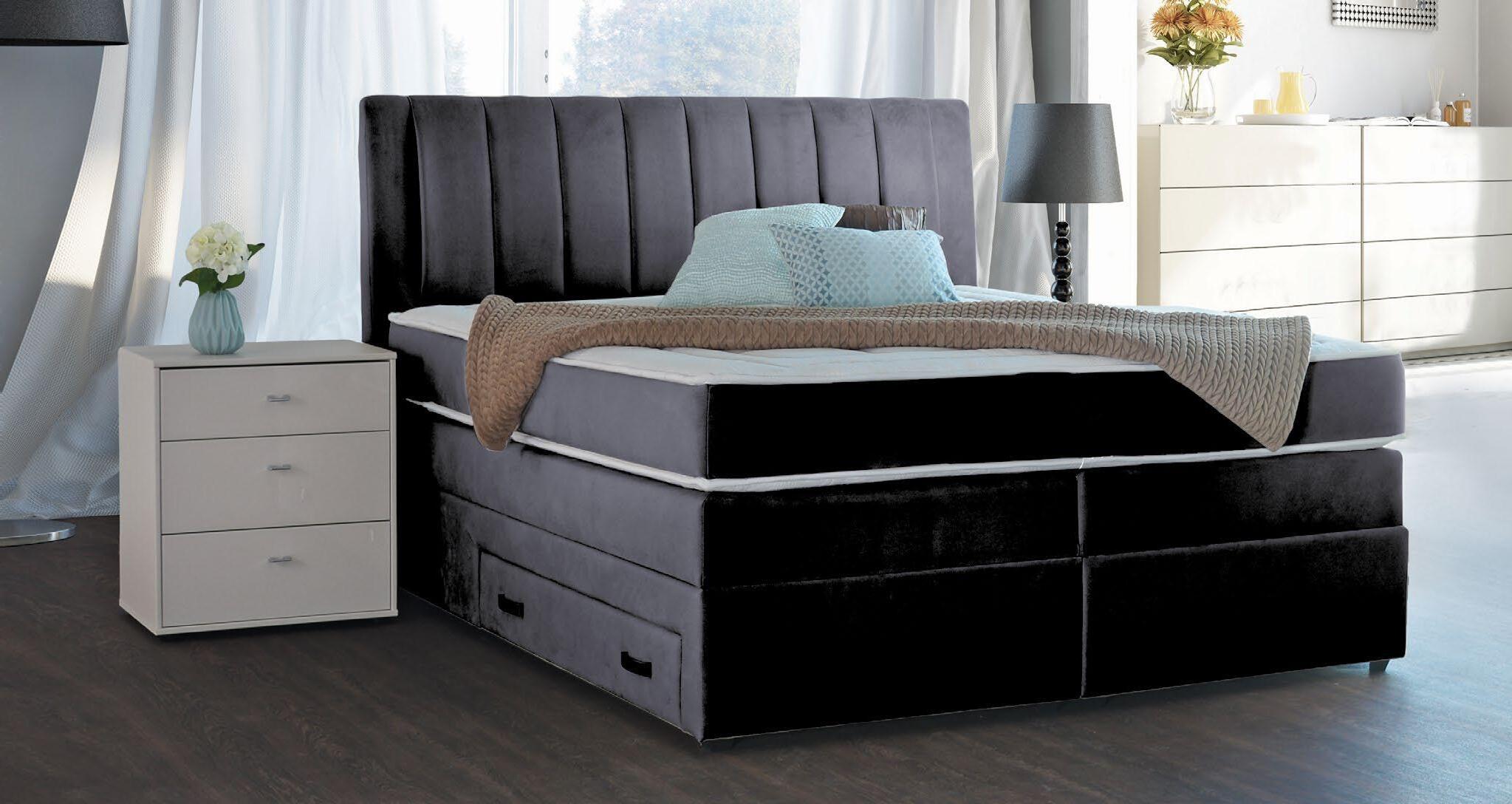 €899 €1.059 Boxspring postelja PRINCE, 160x200cm celotna postelja z vzmetnico, BONEL vzmetenje, 2x predal, blago temno siva