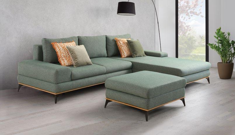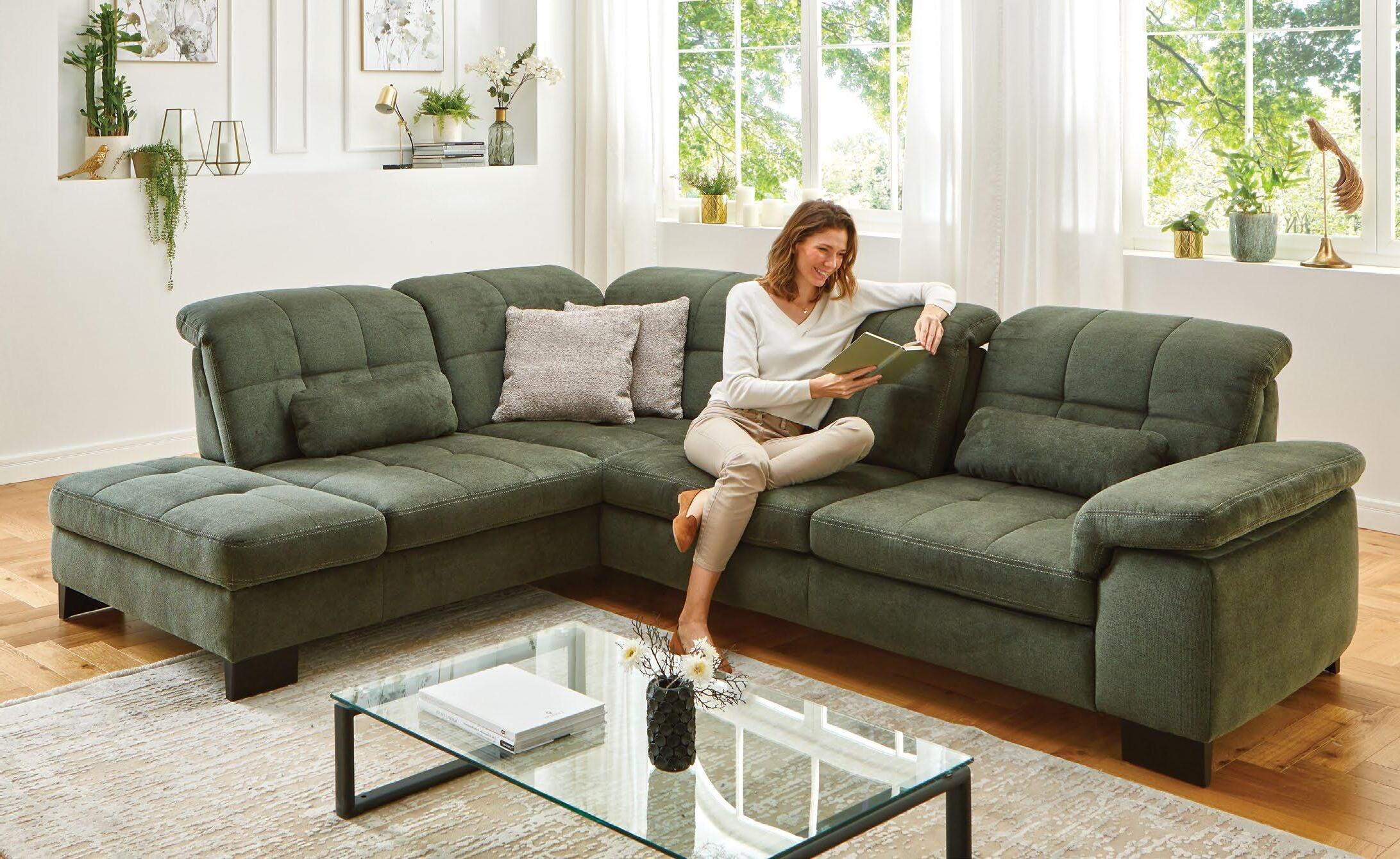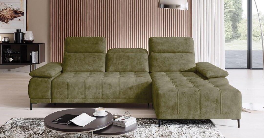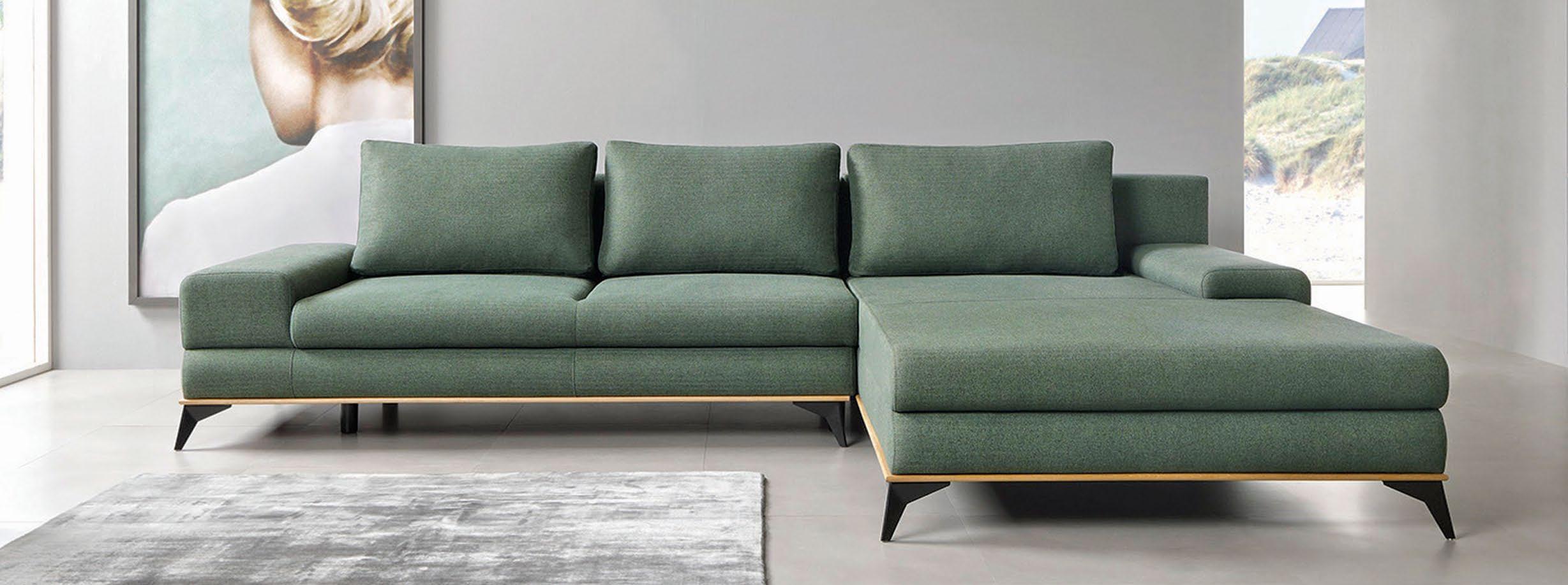 Kotna sedežna garnitura MANILA, vzmeteno 315x212cm, leva ali desna postavitev, ležišče 137x248cm, predal, material kat. 2 SOLID zelena. Tabure za doplačilo.