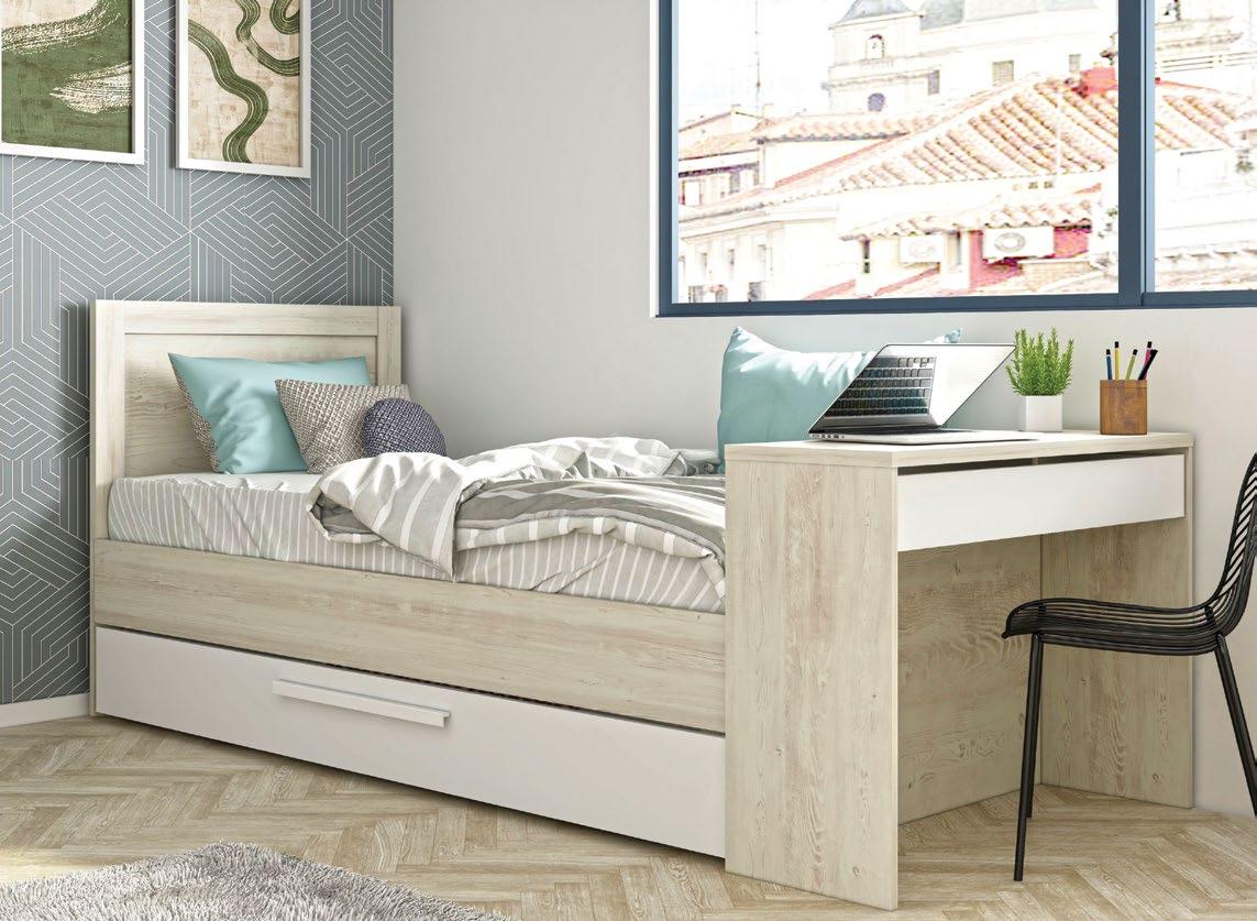 Posteljni okvir z mizo SHIPLEY 238x101x99cm, posteljni okvir 90x200cm, podposteljni predal s koleščki, miza globina 35cm, bela