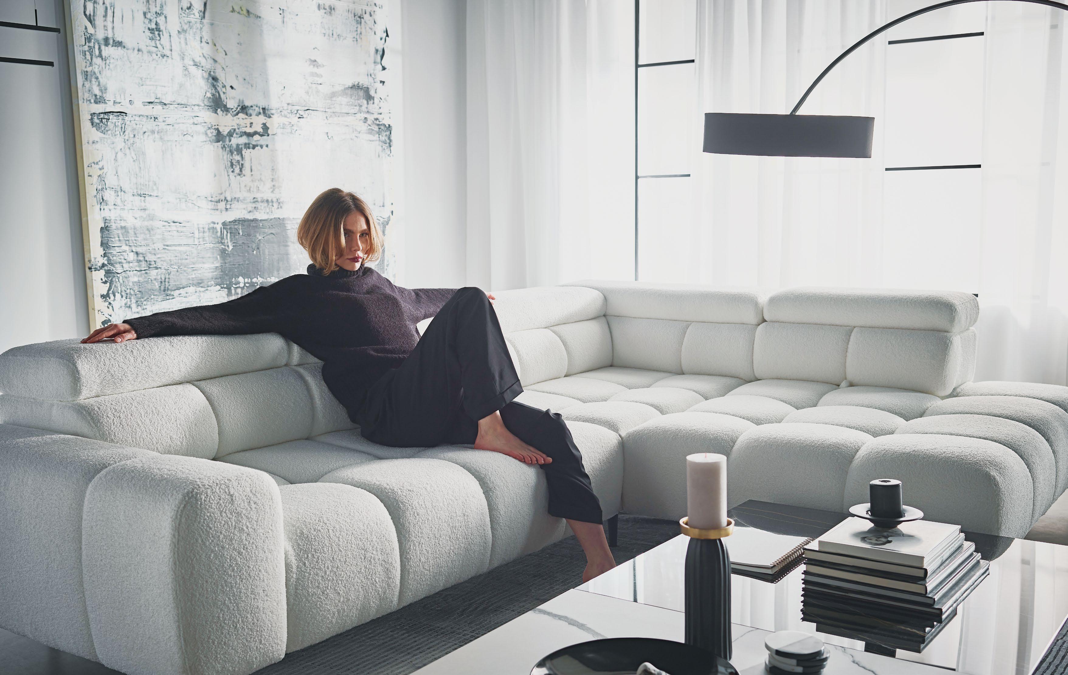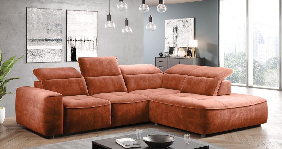 Kotna sedežna CARMELO L, vzmeteno, 296x227cm, leva ali desna postavitev, predal, ele. pomično sedišče, 5x nastavljiv vzglavnik, 1x pomično hrbtišče, mat. kat. 1 SALVADOR