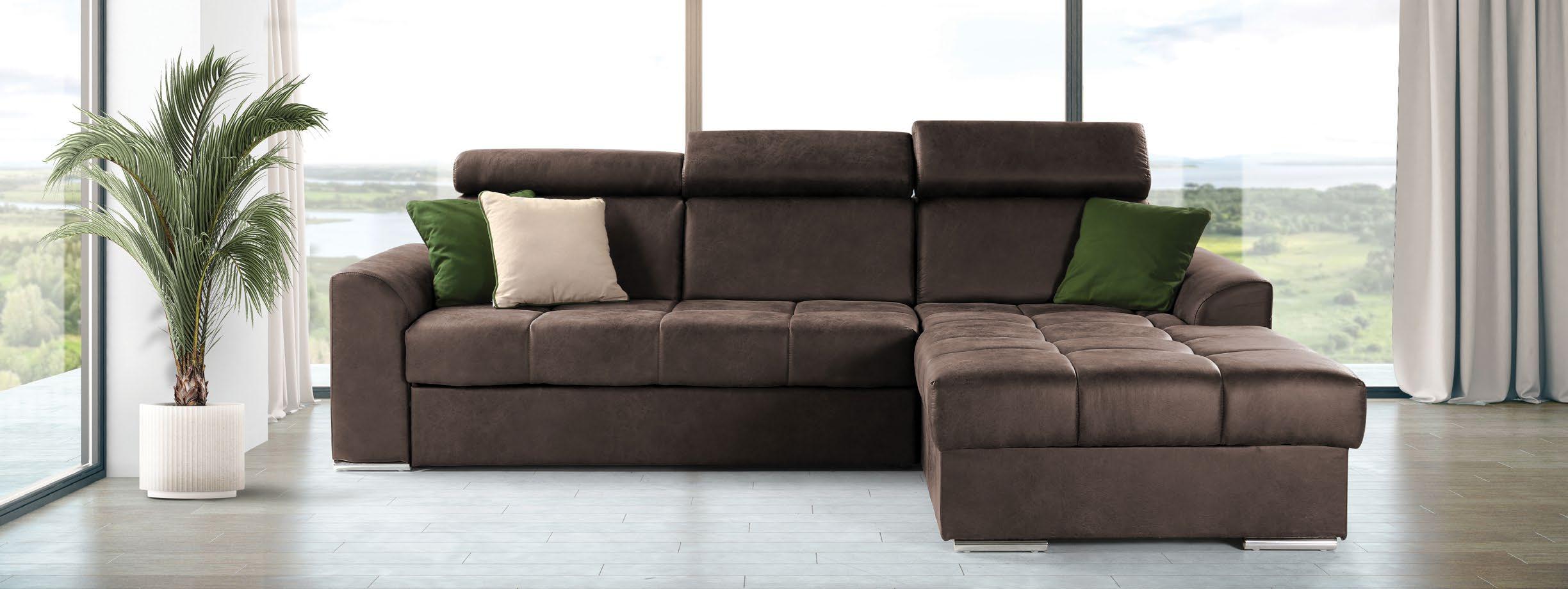 Kotna sedežna garnitura CUBINO S 270x220cm, leva ali desna postavitev, ležišče, predal, 3x nastavljiv vzglavnik, blago KRIT 470 rjava ali 420 bež. Ostale barve (oranžna) za doplačilo.