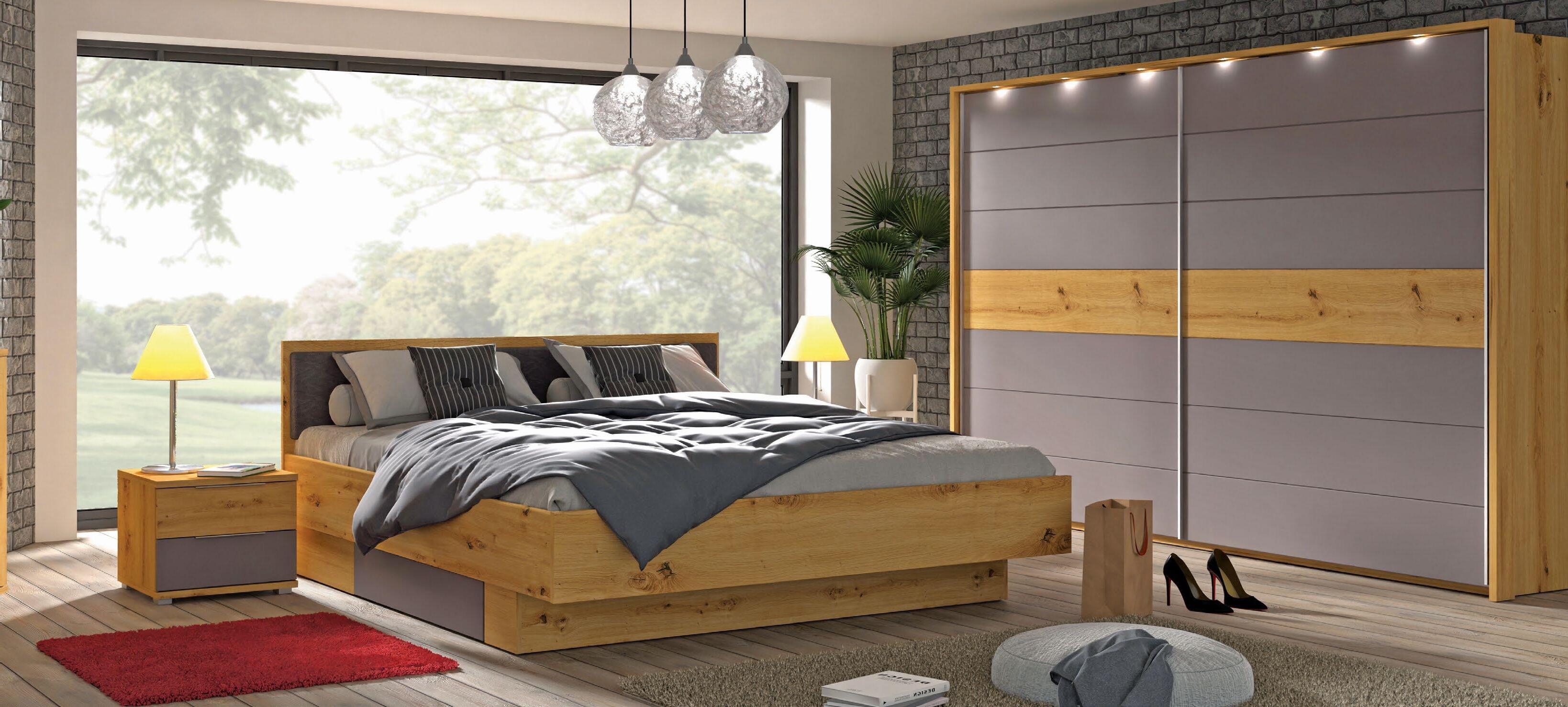€1.049 €1.176 Celotna spalnica DENVER posteljni okvir 160x200cm, 2x nočna omarica 45x46x40cm, garderobna omara 270x225x60cm, artisan hrast/siva. Okrasni okvir na omari za doplačilo.
