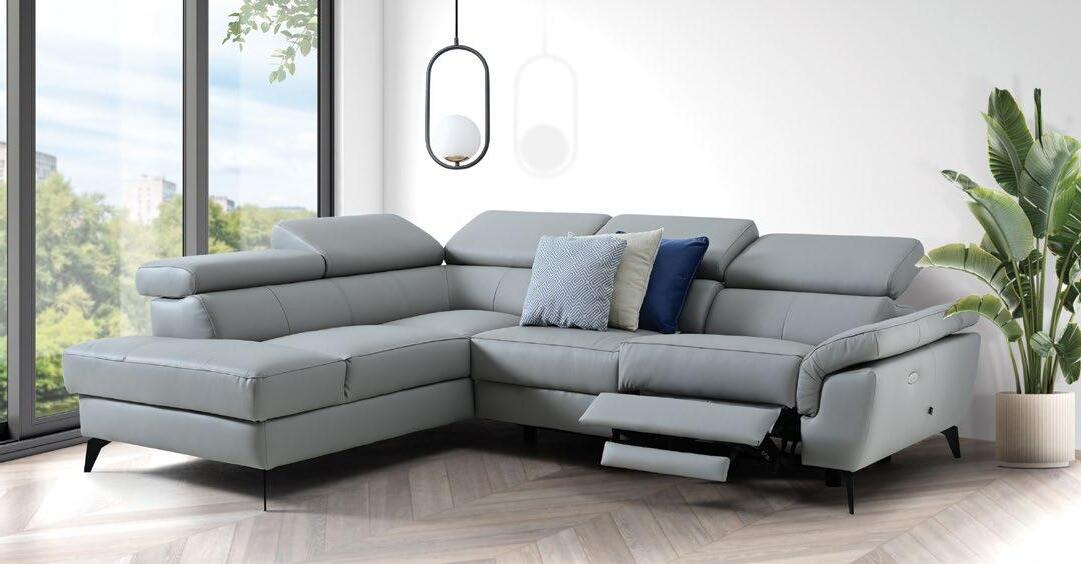€2.990 Usnjena kotna sedežna garnitura SOREN, 210x265cm, leva ali desna postavitev, 1x električni počivalnik, 5x nastavljiv vzglavnik, usnje/um.usnje 518 siva