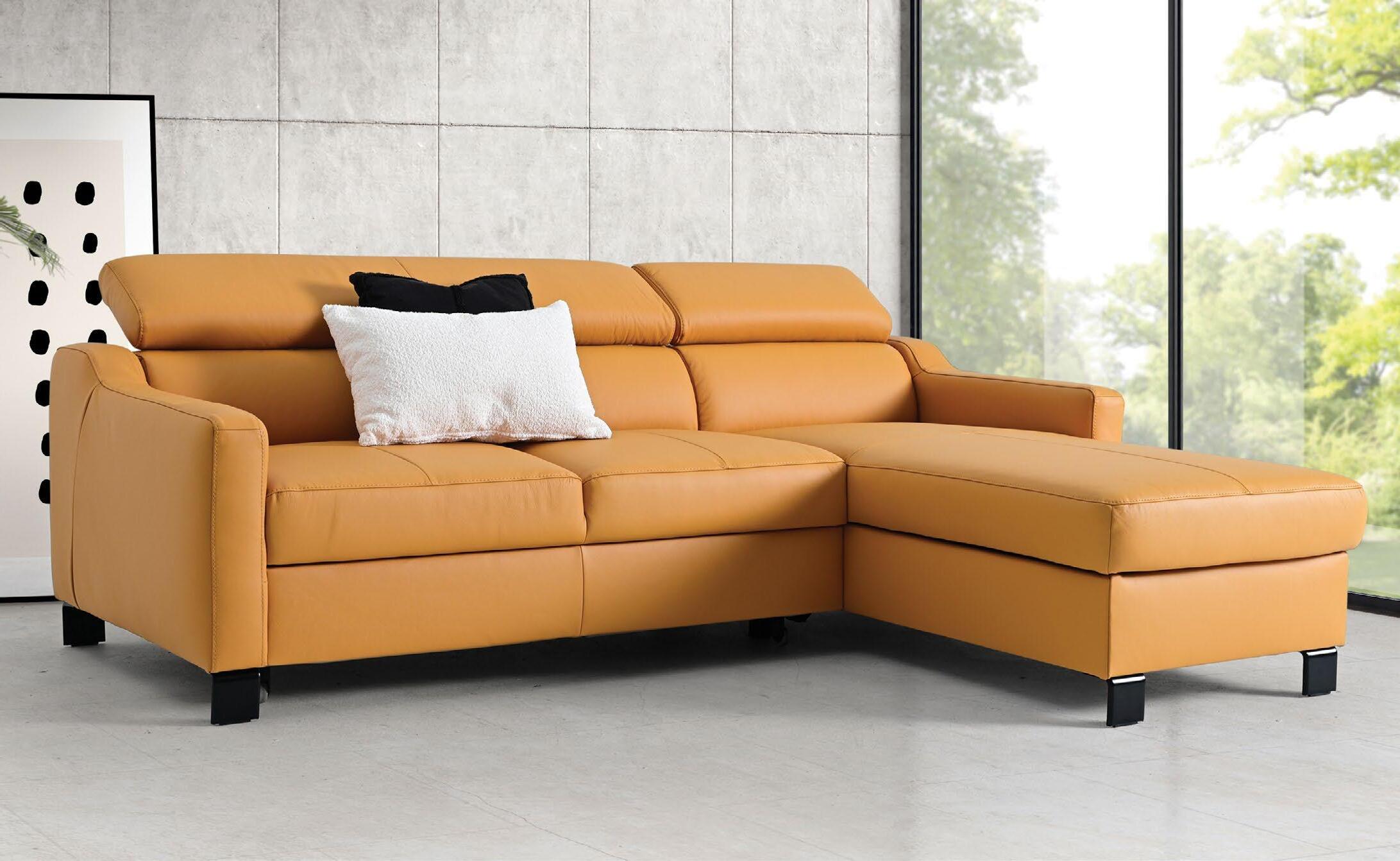 €1.250 €1.790 Usnjena kotna sedežna garnitura BERNIE 226x176cm, leva ali desna postavitev, ležišče, predal, 3x nastavljiv vzglavnik, usnje/um.usnje