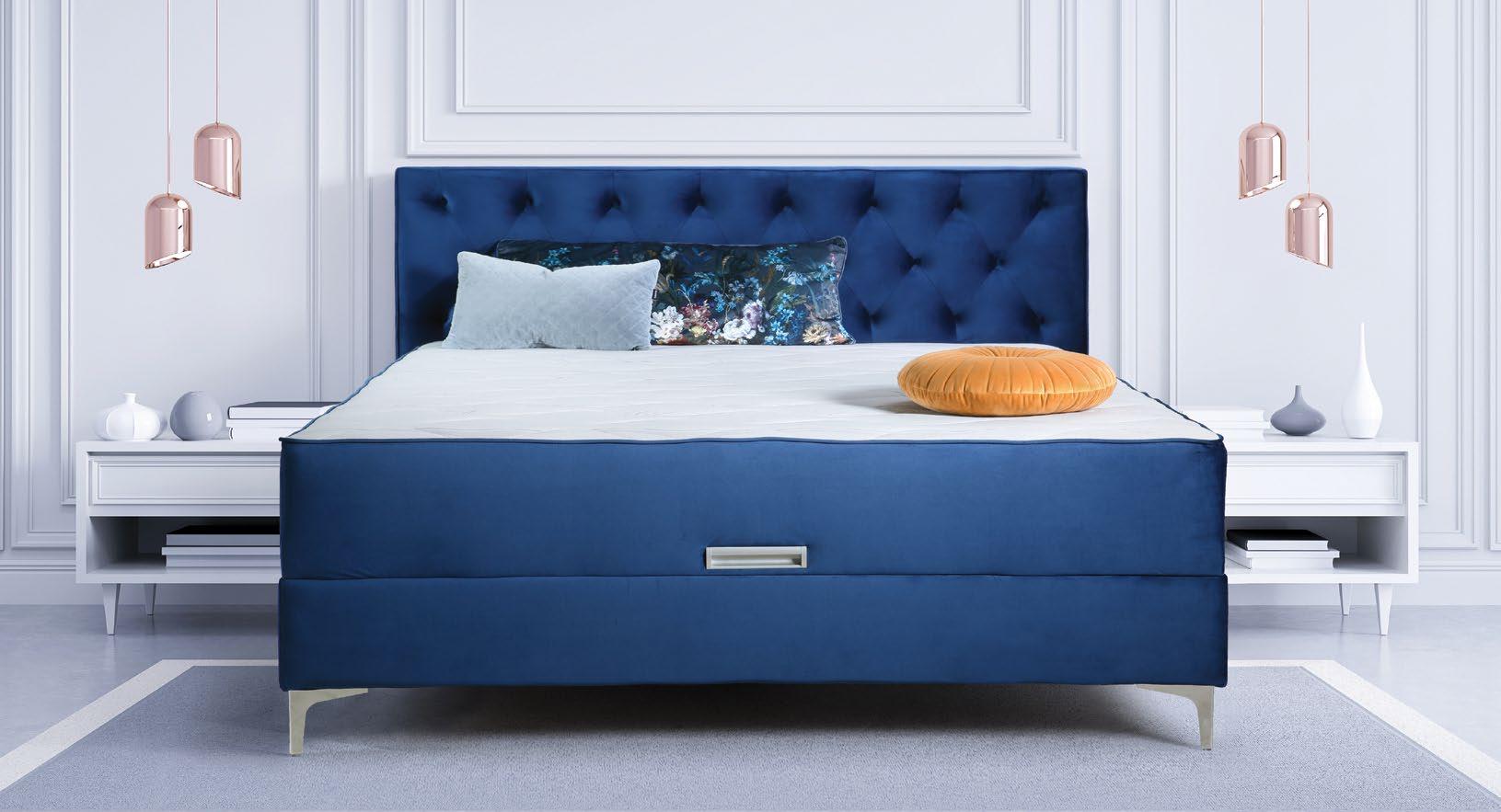€919 Celotna postelja QUEEN, 160x200cm celotna postelja z vzmetnico, višina vzglavja 110cm, BONEL vzmetenje, dvižno dno, predal, material RIVIERA 81 temno modra €1.059 Boxspring postelja PRINCE, 160x200cm celotna postelja, 2x predal, material IBIS različne barve