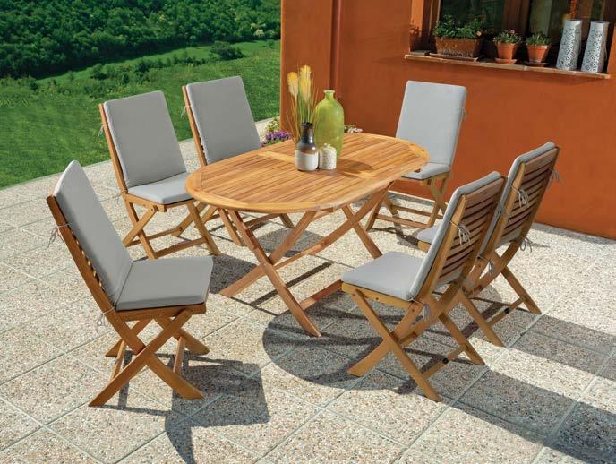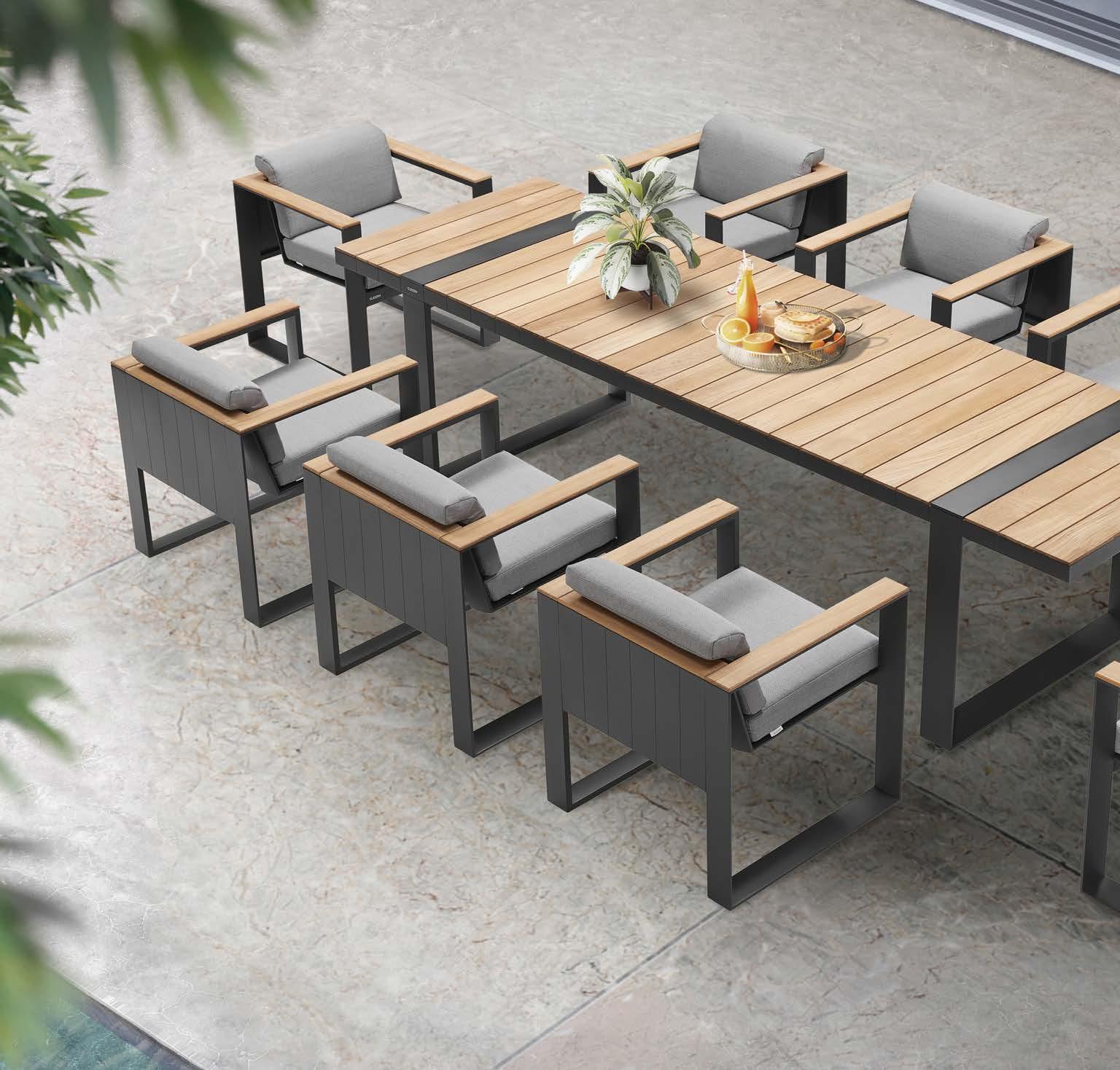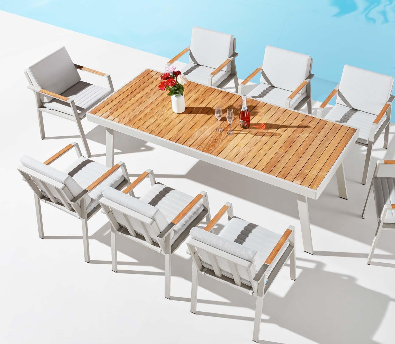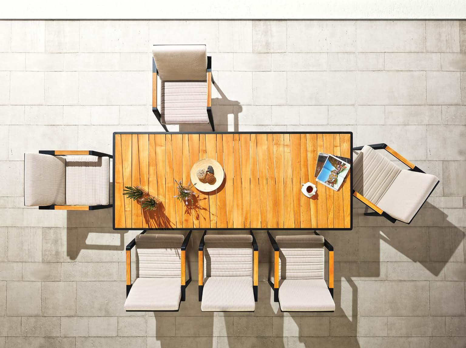 Set BORROMEO, 7 kosov miza 103x217cm, 6x stol z blazinami, aluminij/tik/vrv