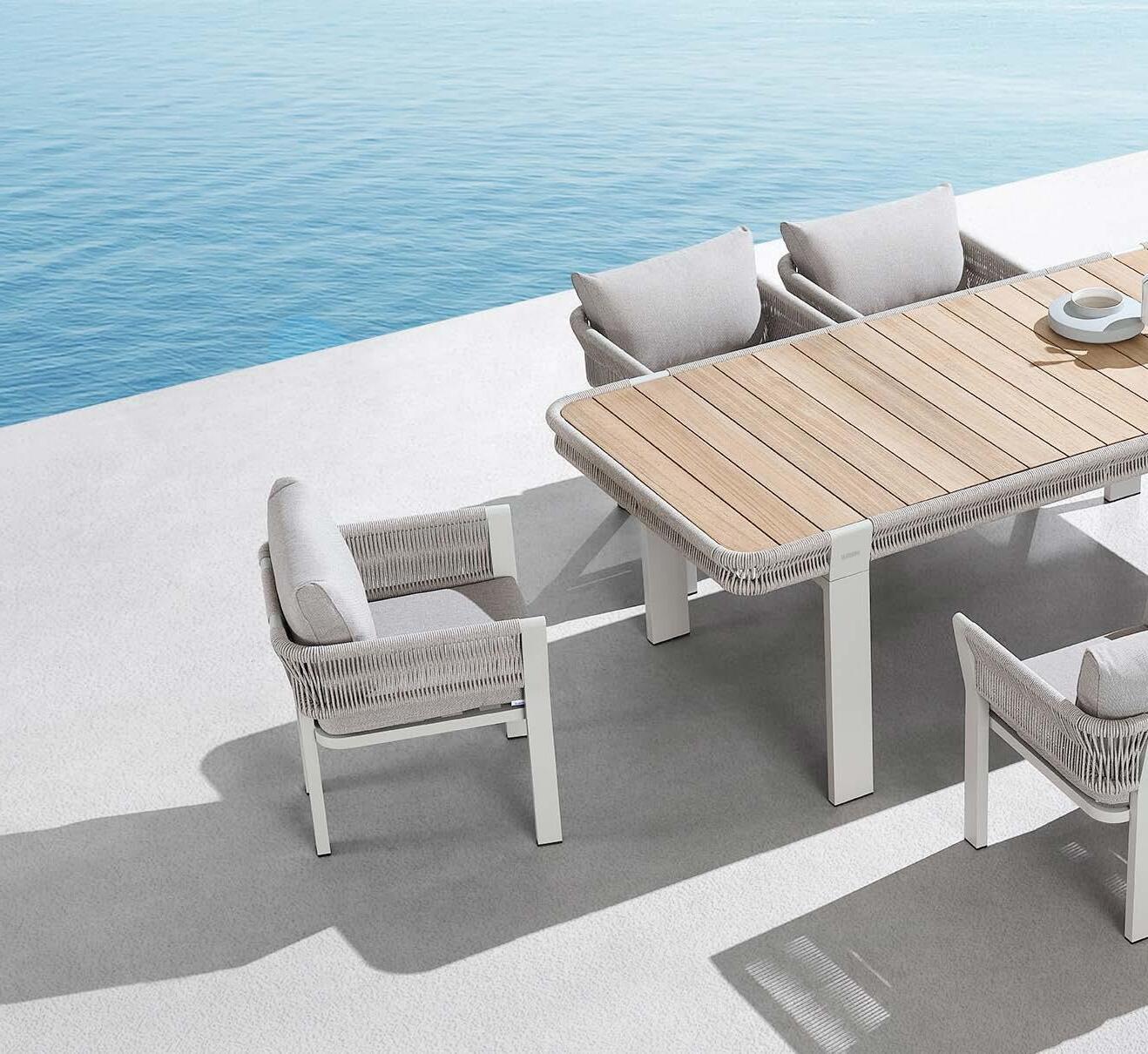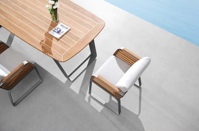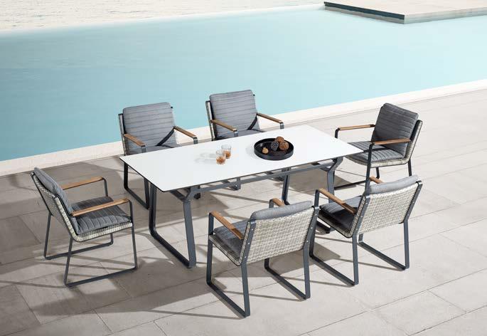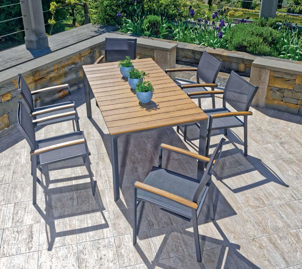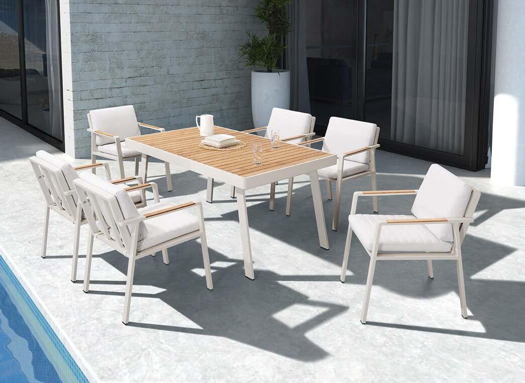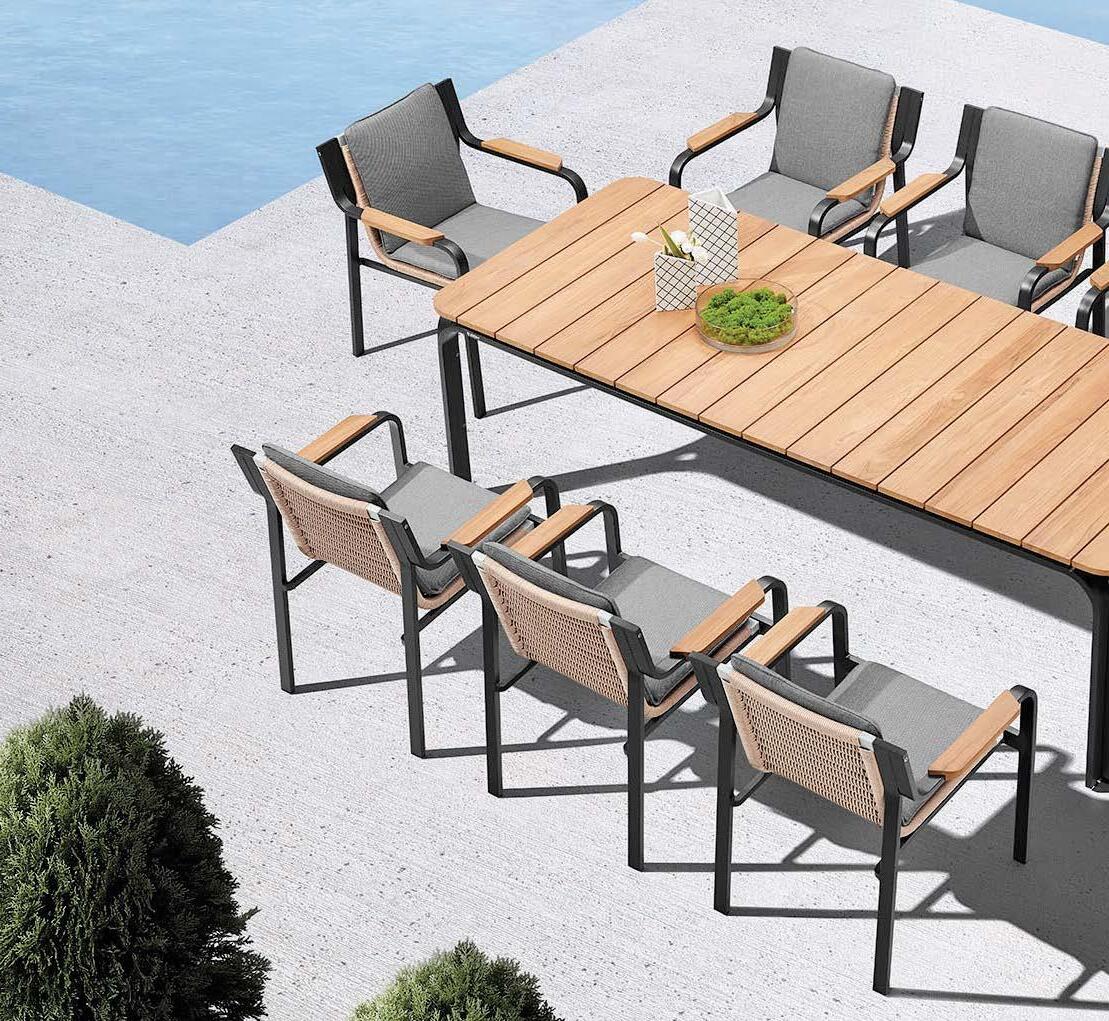 Set BORROMEO, 7 kosov miza 103x217cm, 6x stol z blazinami, aluminij/tik/vrv