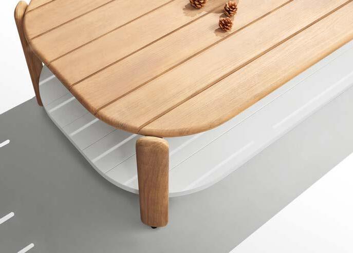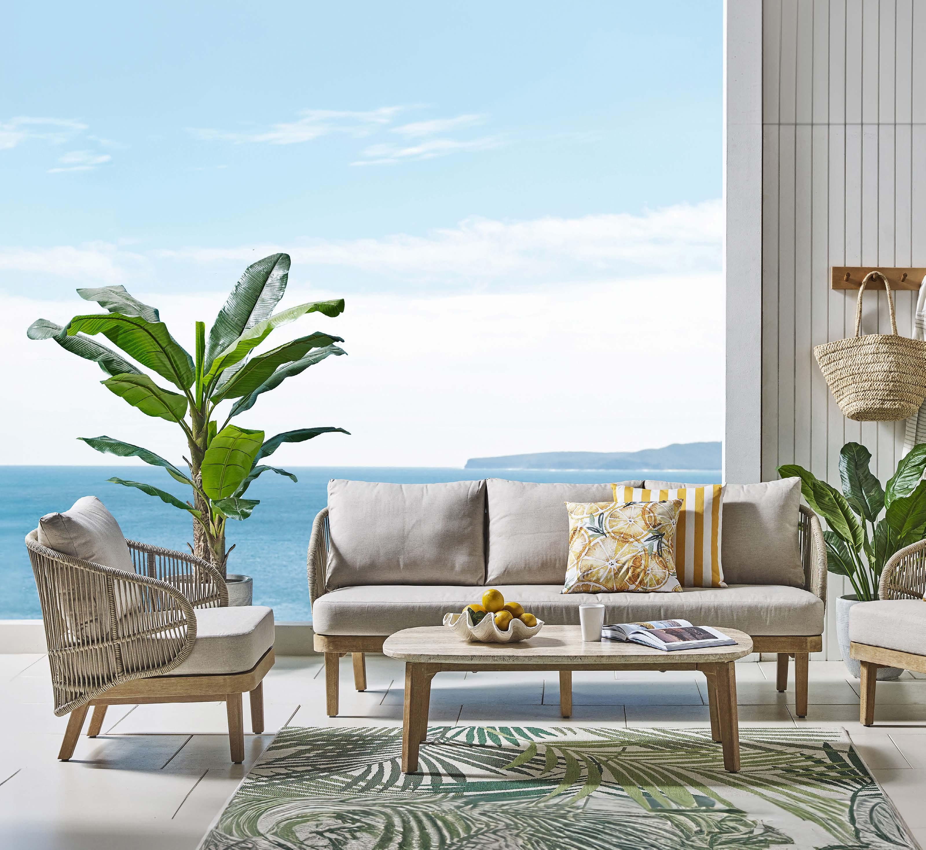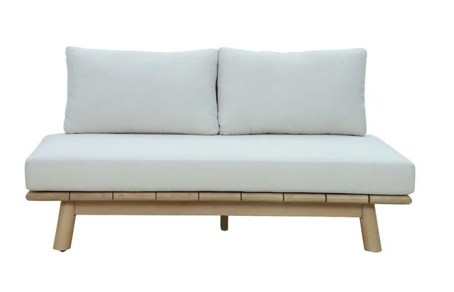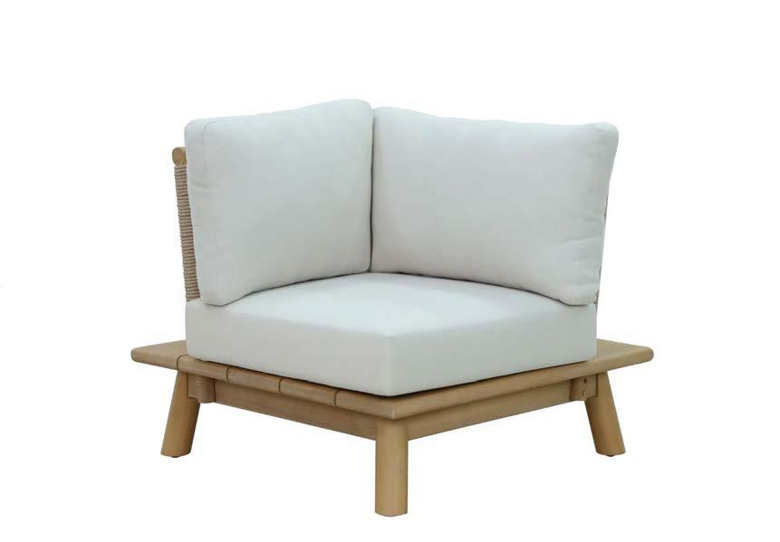 Leseni deli pohištva pričarajo toplo in nežno vzdušje, medtem ko tkane strukture spominjajo na vrvico viseče mreže. Zaobljene oblike in mehke blazine dodajo harmonijo in občutek miru. V vaši duši puščajo sled lahkotnosti, dobrega počutja in razbremenitve — popolno mešanico na koncu napornega dneva.