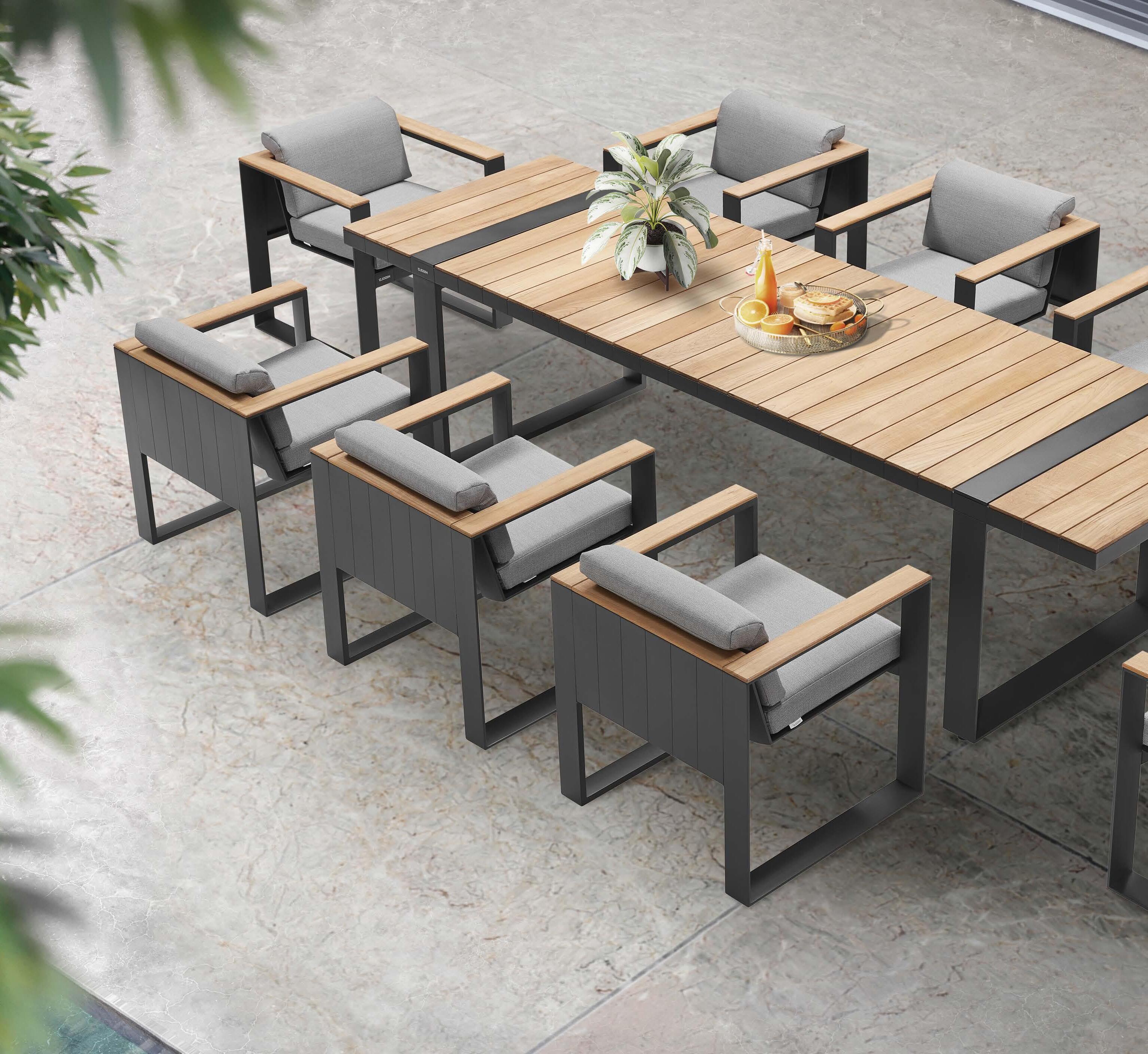 Set BORROMEO, 7 kosov miza 103x217cm, 6x stol z blazinami, aluminij/tik/vrv