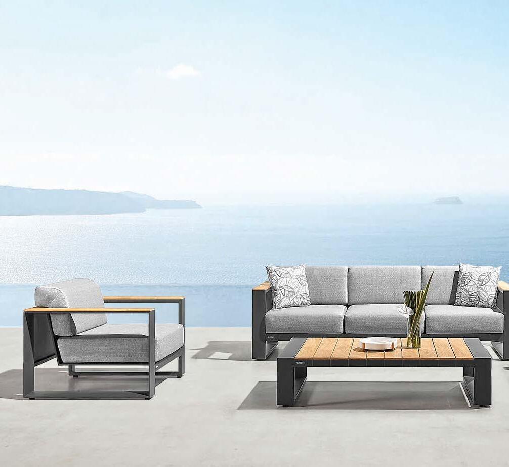 3-sed z blazinami 238x82cm, 2x fotelj z blazinami 97x82cm, mizica 75x110cm, mizica 75x80cm, aluminij/tik/vrv