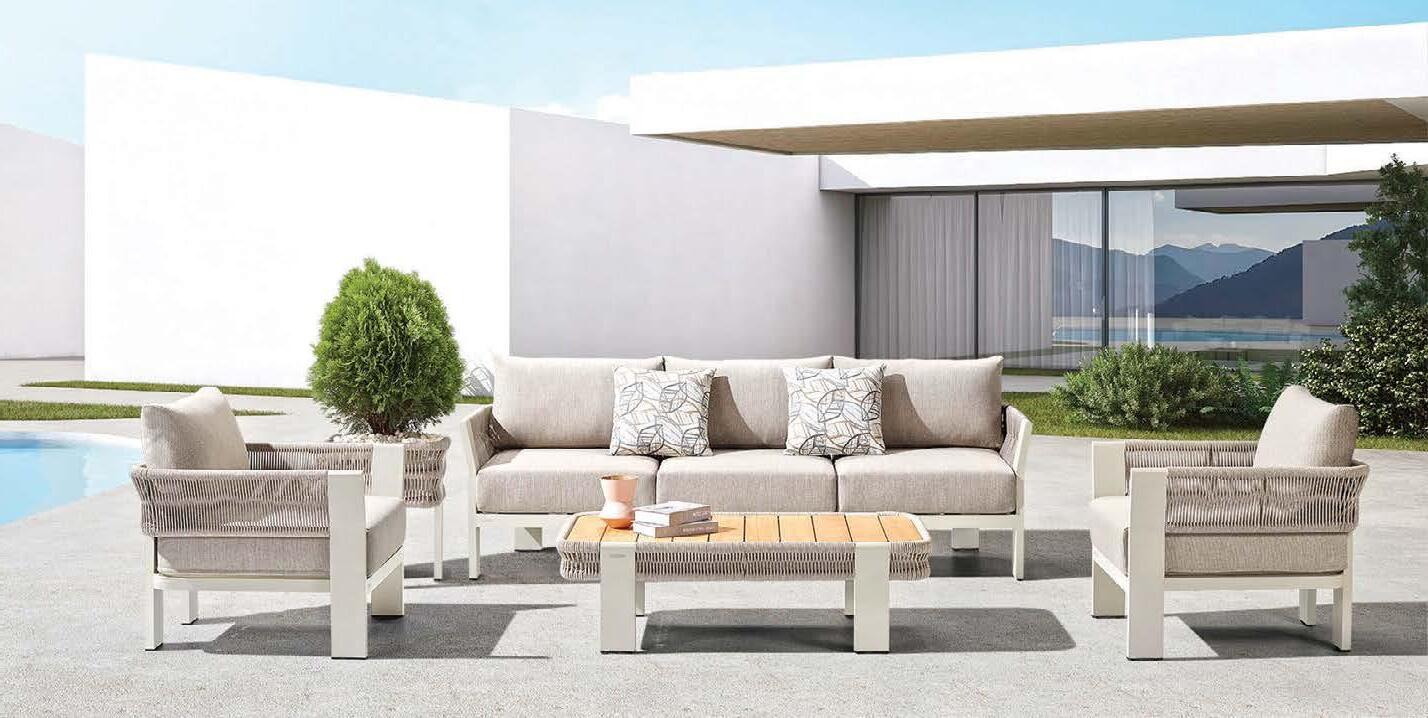 3-sed z blazinami 217x77cm, 2x fotelj z blazinami 81x77cm, mizica 70x120cm, aluminij/tik/vrv. Na voljo dve barvni kombinaciji.