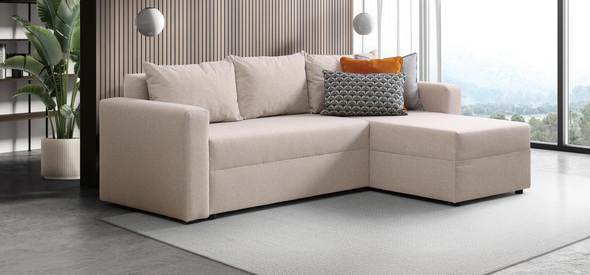 Kotna sedežna garnitura KATY, 230x160cm, leva ali desna postavitev, ležišče, predal, blago kategorija 1, različni materiali in barve