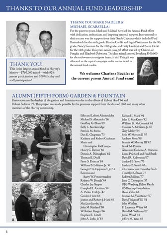Restoration and leadership of the garden and fountain was due to the efforts of Robert Hard ’66 and Robert Sullivan ’77. This project was made possible by the generous support from the class of 1966 and many other members of the Harvey community. Effie and Lefteri Afentoulides Michael S. Alexander ’66 Geoffrey G. Blum ’69 Sally L. Breckenridge Patricia M. Burns Dan K. Chapman ’73 Kathryn and Robert Cushman Maria and Christopher DelCampo Henry C. Devine ’66 Dennis A. Dilmaghani ’62 Thomas E. Dodd Peter S. Duncan ’65 William B. Eddison, Jr. ’37 George P. A. Eysymontt, Jr. ’53 Rowena and Barry W. Fenstermacher Roberts W. French ’49 Charles Jay Gaspar Campbell L. Graham ’54 A. Parker Hall, Jr. ’42 Gordon Hard ’66 Jeanne and Robert J. Hard ’66 MacLear Jacoby, Jr. John M. Kindred ’50 W. Robert Kreger ’66 Stephen R. Littell John A. Luke, Jr. ’63