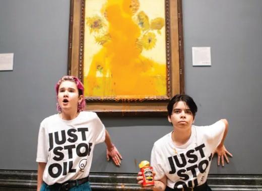 Activists from the Just Stop Oil organization throw tomato soup on Van Gogh’s Sunflowers at the National Gallery.