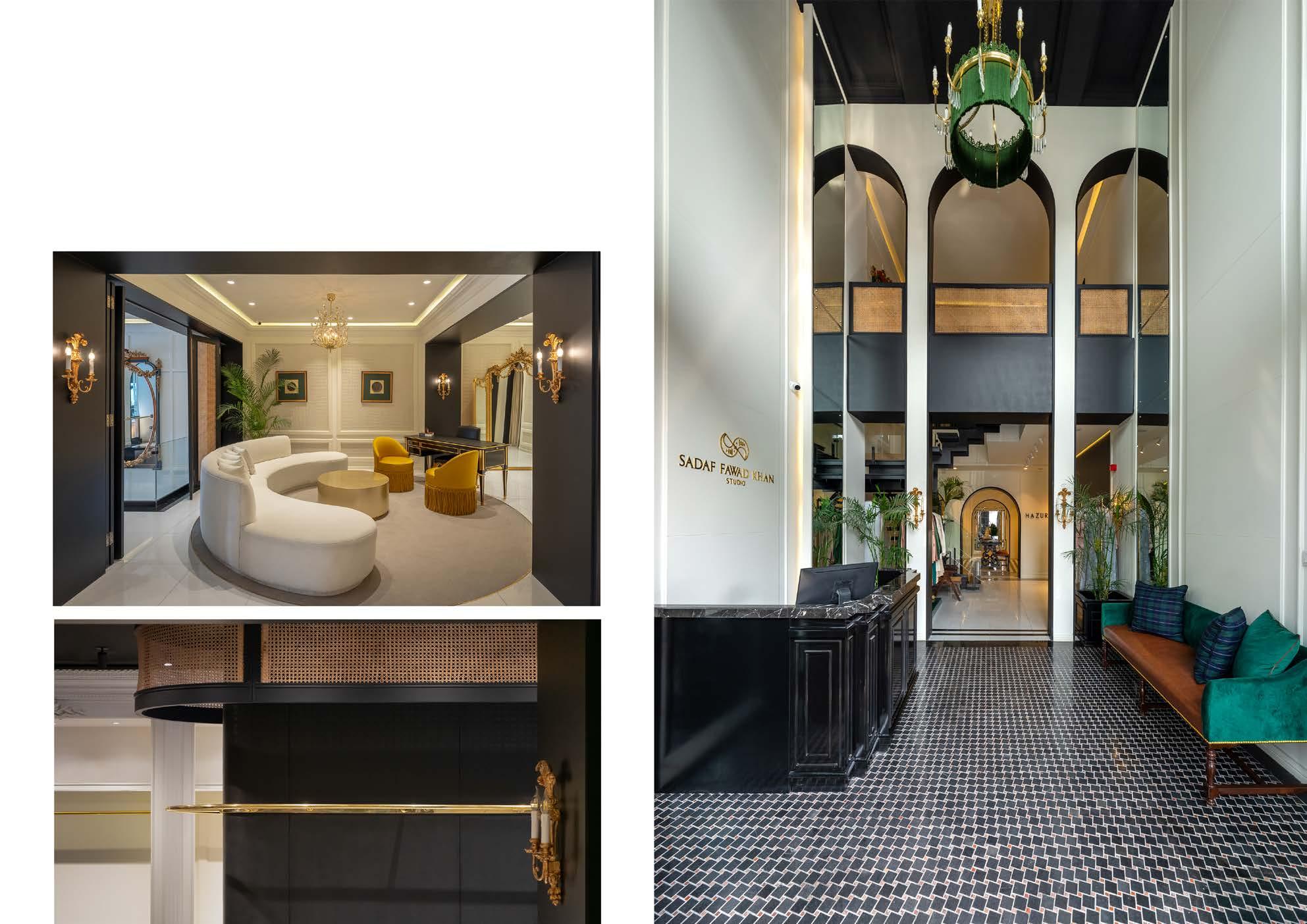 The high end boutique was designed with emphasis on an eclectic material palette. The interior experience of the new bridal studio was based on monochromatic colors that served as a neutral background for bespoke furniture and material finishes. Local materials such as cane screens, ceramic floor tiles and black marble slabs were paired with brass and gold leaf to create a holistic environment for clients.