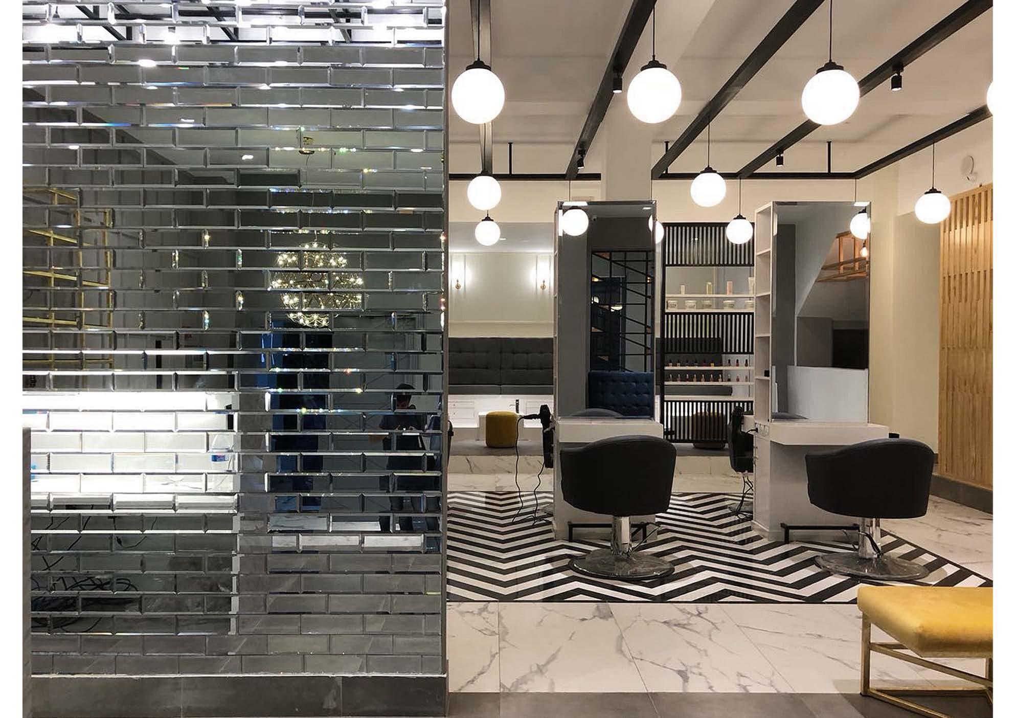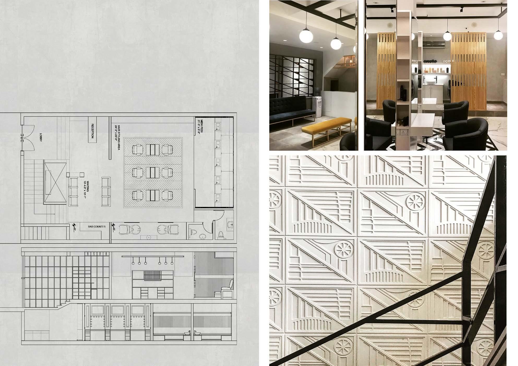 Commissioned by leading Pakistani make-up artist Numra Waqas, the studio is an exercise in expressing notions of aesthetics by assembling surfaces of diverse qualities (matte, textured, reflective, patterned, relief). Screens were used to partition and seperate functional spaces to maintain spatial continuity without creating harsh sub-divisions, while neutral tones with nuances of brass and copper were applied to create highlighted moments in the interior. .