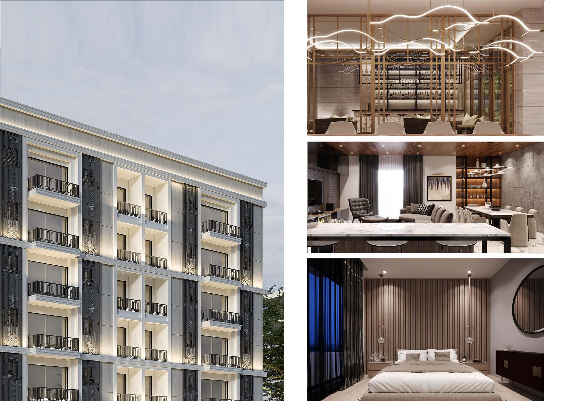 Interior planning and alteration was performed on the existing shell of the multi-storey residential building to create practical living spaces. The building’s layout was optimized for functionality while maintaining a comfortable and inviting atmosphere. The elevations of the building, visible from multiple viewpoints from the main road, were designed to maintain a continuity of windows and terraces to generate variation and sophistication. The overall design is both stylish and functional, creating an aesthetically sound and functional living space that meets the needs of its residents and is appealing to visitors.